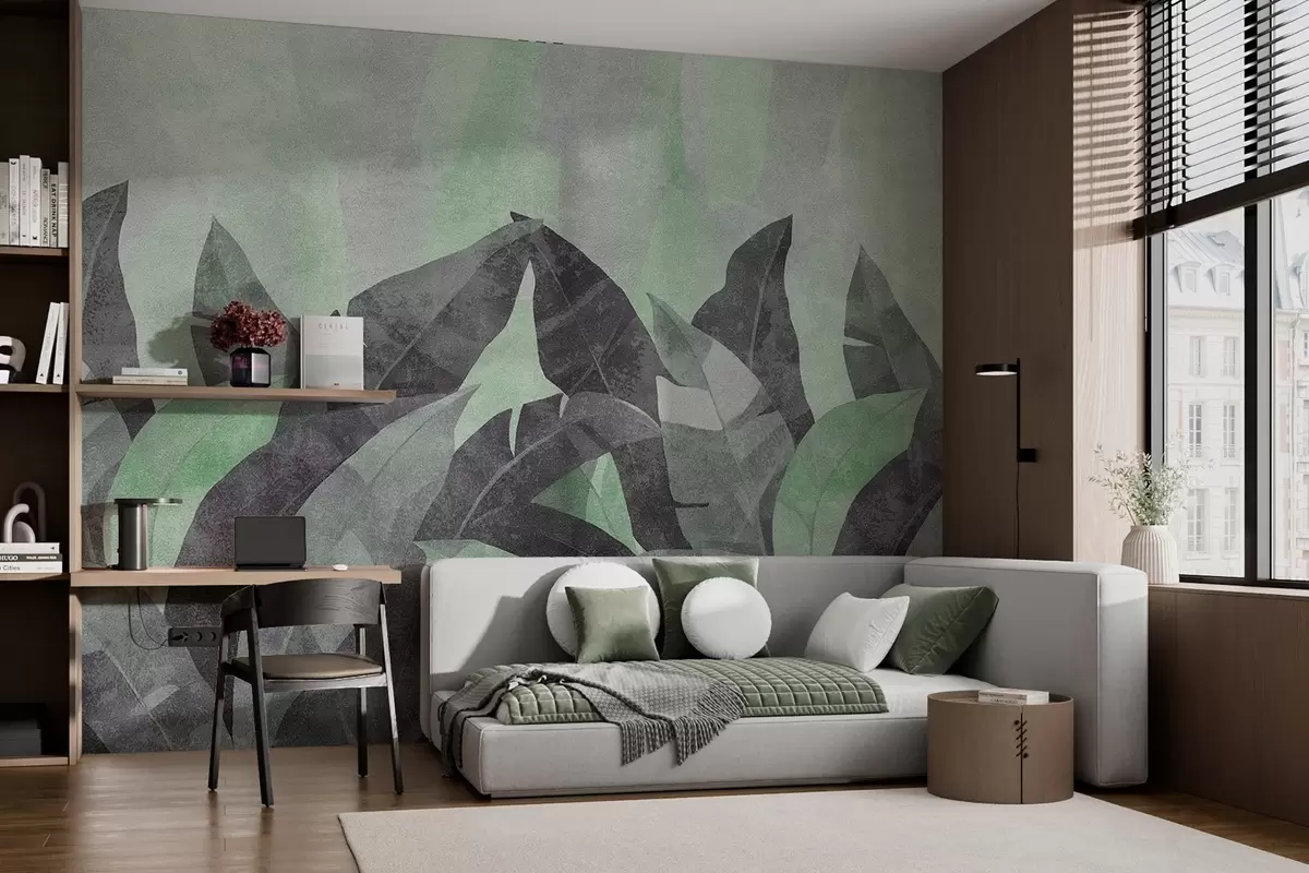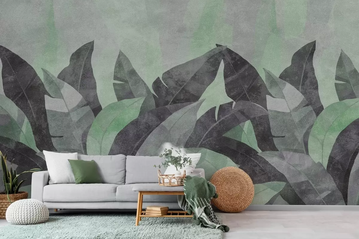 Valokuvatapetti kuvioidut banaaninlehdet vihreän ja harmaan sävyissä Nr w04285v1