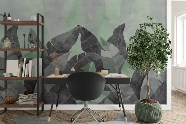 Valokuvatapetti kuvioidut banaaninlehdet vihreän ja harmaan sävyissä Nr w04285v1