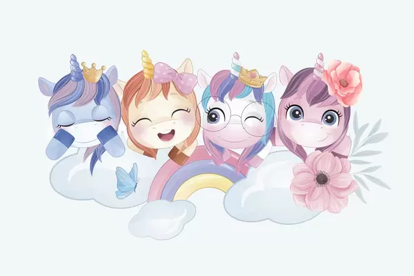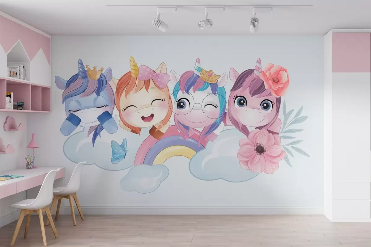 Valokuvatapetti Söpöjä yksisarvisia pilvien ja sateenkaarien keskellä Nr w04298