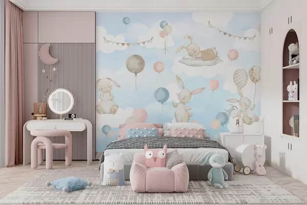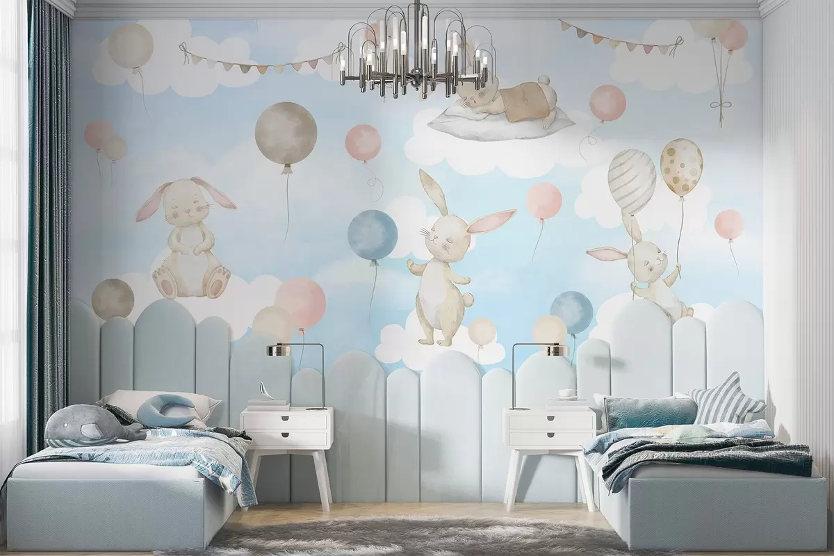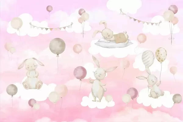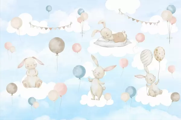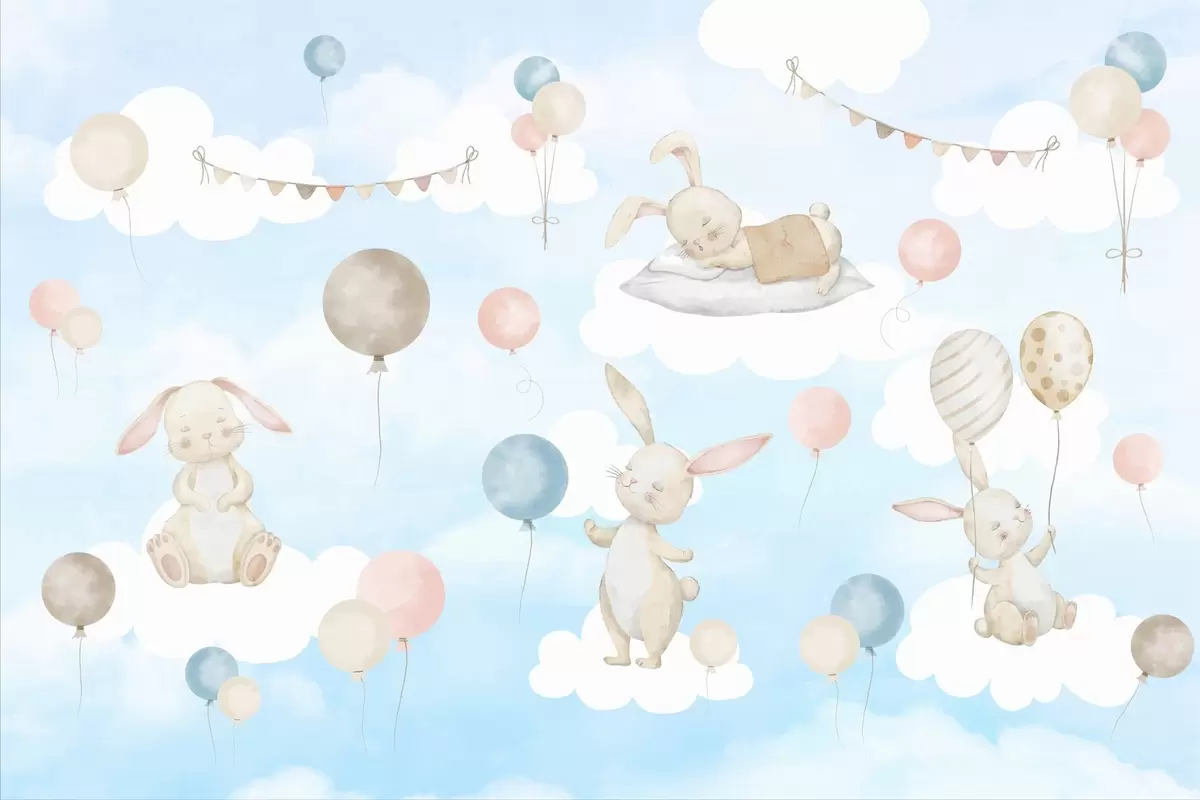 Valokuvatapetti Jänikset ilmapallojen kanssa pilvissä Nr w04337