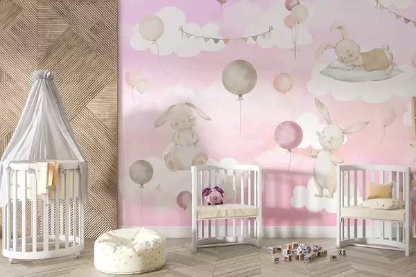 Valokuvatapetti Jänikset ilmapallojen kanssa pilvissä Nr w04337v1