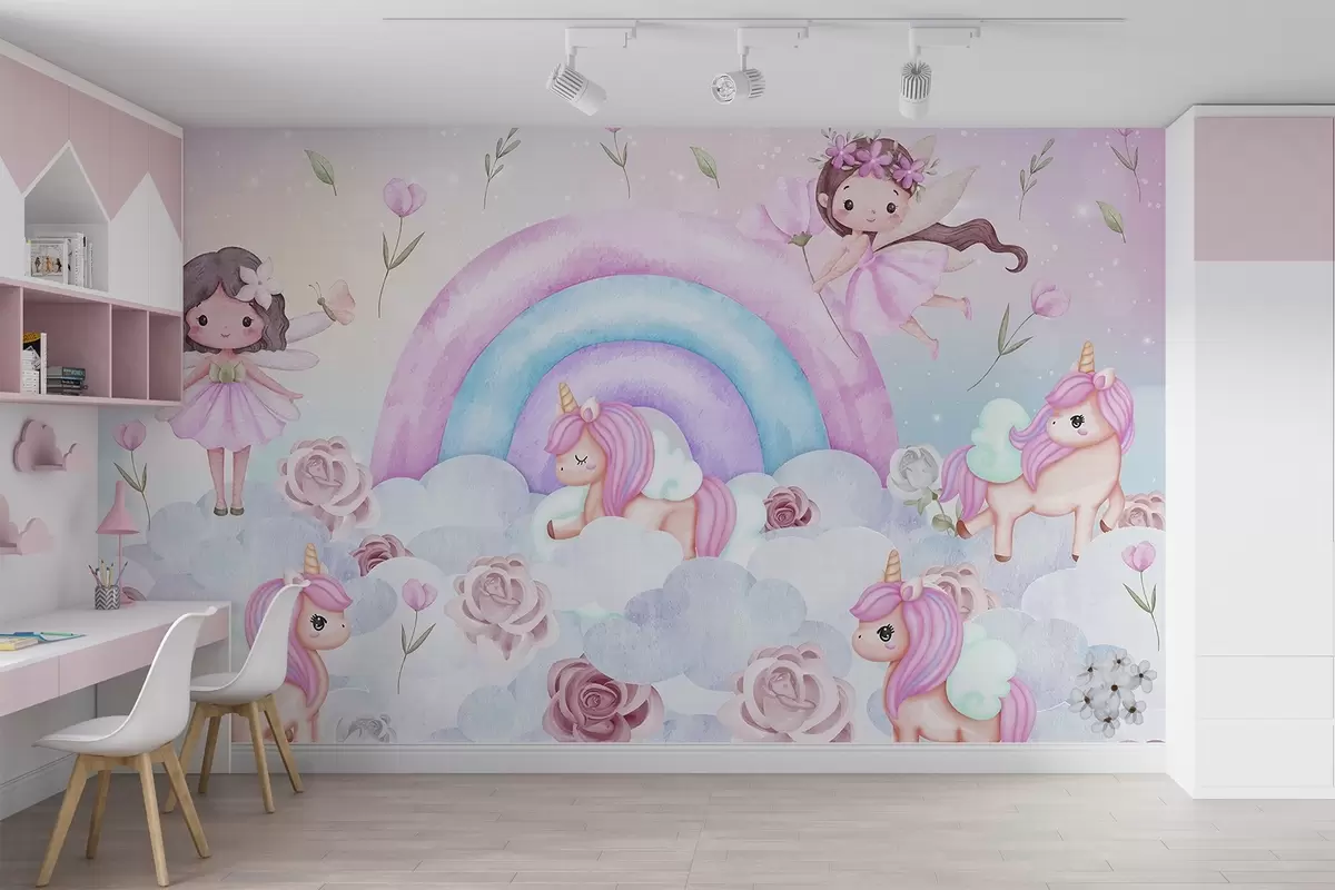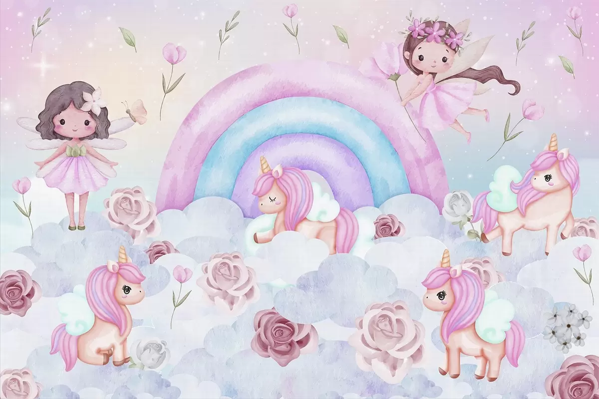 Valokuvatapetti Keijuja ja yksisarvisia pilvien ja sateenkaarien keskellä.. Nr w04371