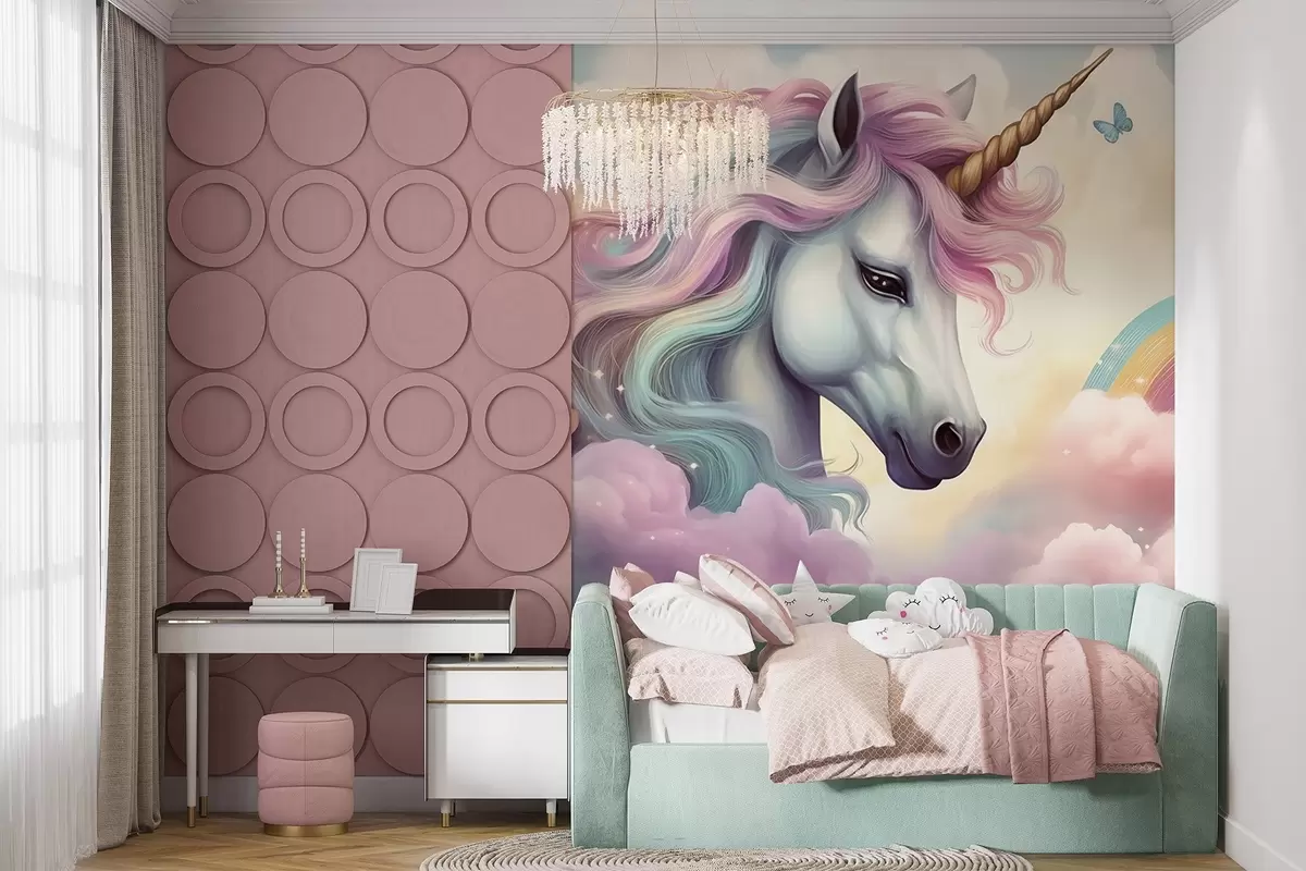 Valokuvatapetti Yksisarvinen pilvisellä taivaalla sateenkaaren kanssa Nr w04372
