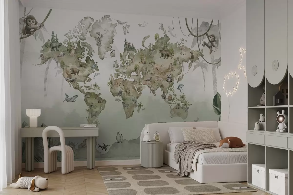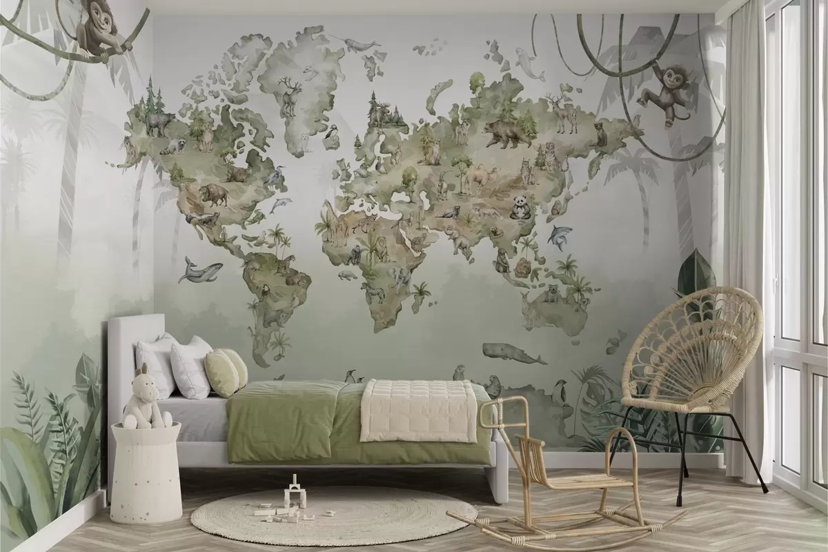 Valokuvatapetti Kuvitettu maailmankartta, jossa on eläimiä ja viidakoita Nr w04418v1