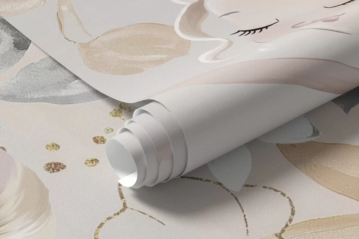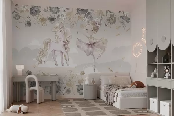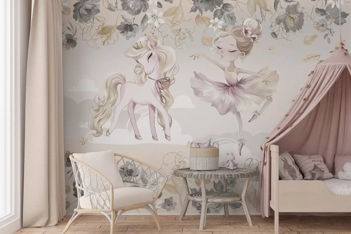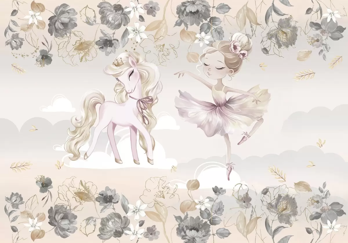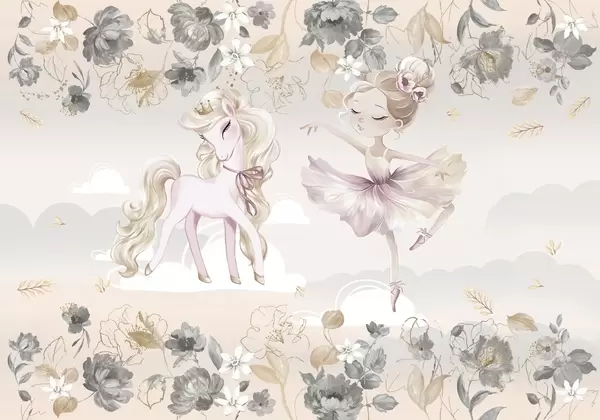 Valokuvatapetti Lumivalkoinen poni ja ballerina kukkien ja pilvien keskellä Nr w04419