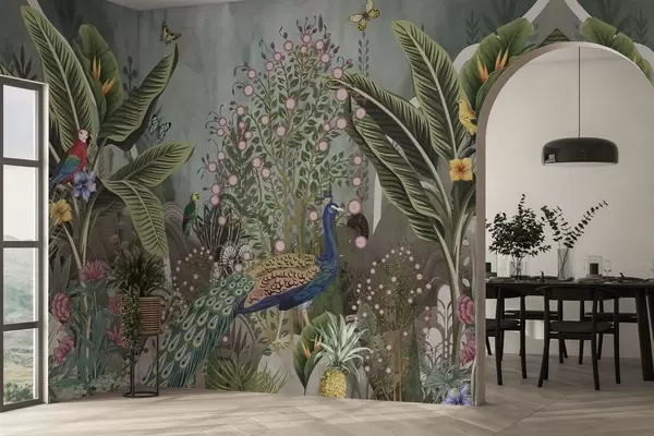 Valokuvatapetti Kirkkaat trooppiset linnut ja riikinkukko eksoottisten kasvien keskellä Nr w04457