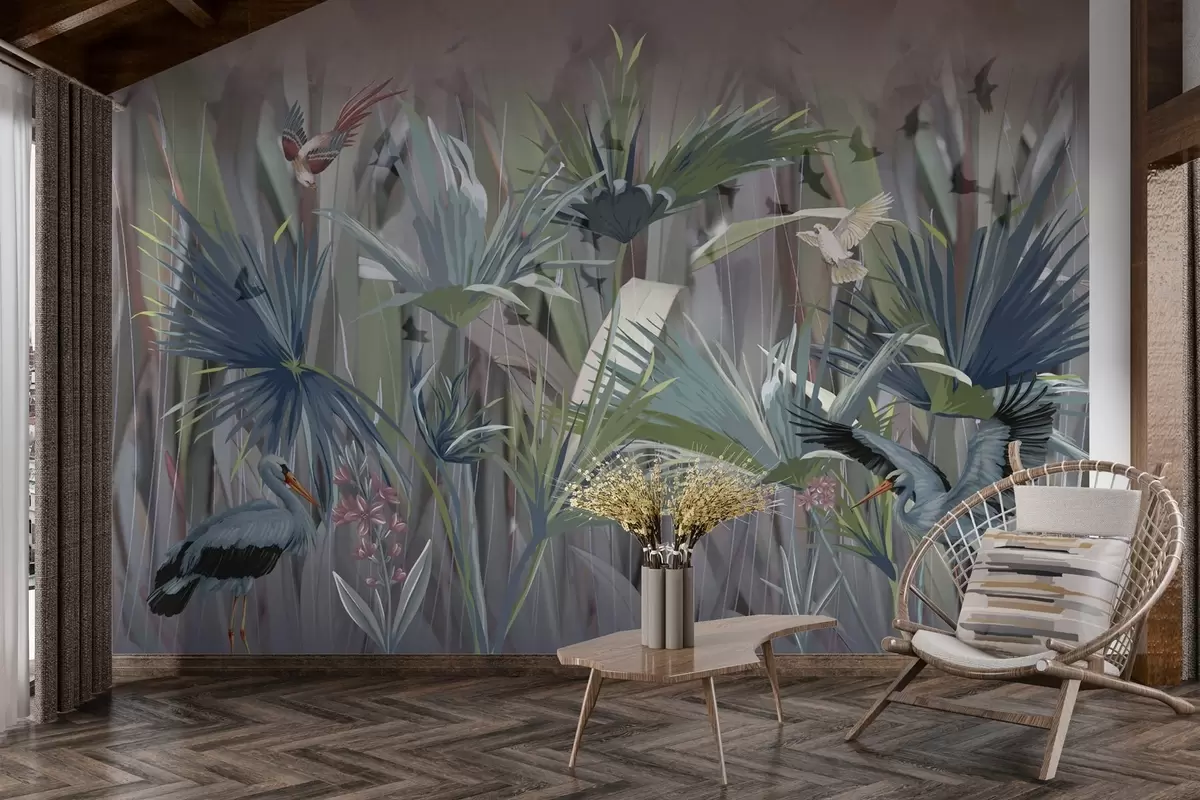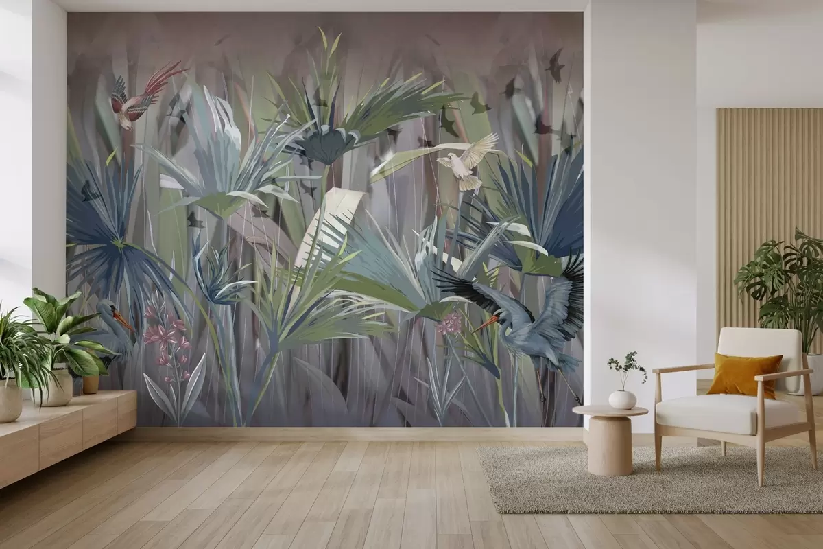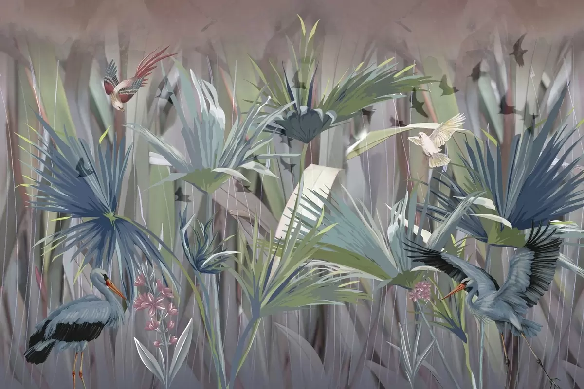 Valokuvatapetti Eksoottisia lintuja palmunlehtien ja kukkien keskellä Nr w04458