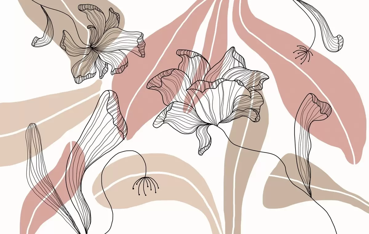 Valokuvatapetti abstraktit lehdet ja kukat jauhemaisissa ja beigeissä sävyissä Nr w04499