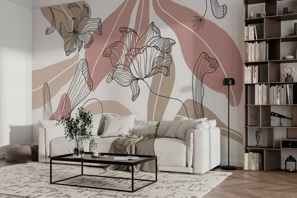 Valokuvatapetti abstraktit lehdet ja kukat jauhemaisissa ja beigeissä sävyissä Nr w04499