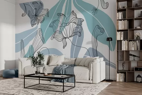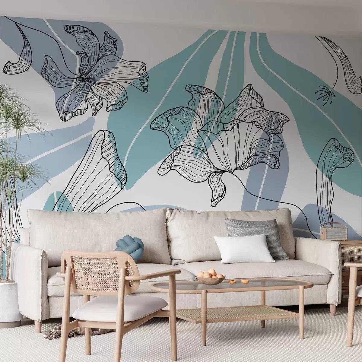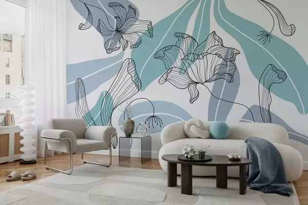 Valokuvatapetti abstraktit lehdet ja kukat sinisissä sävyissä Nr w04499v2