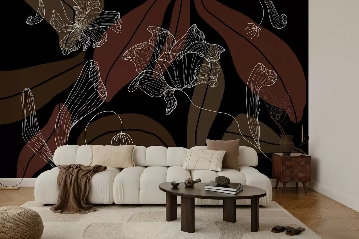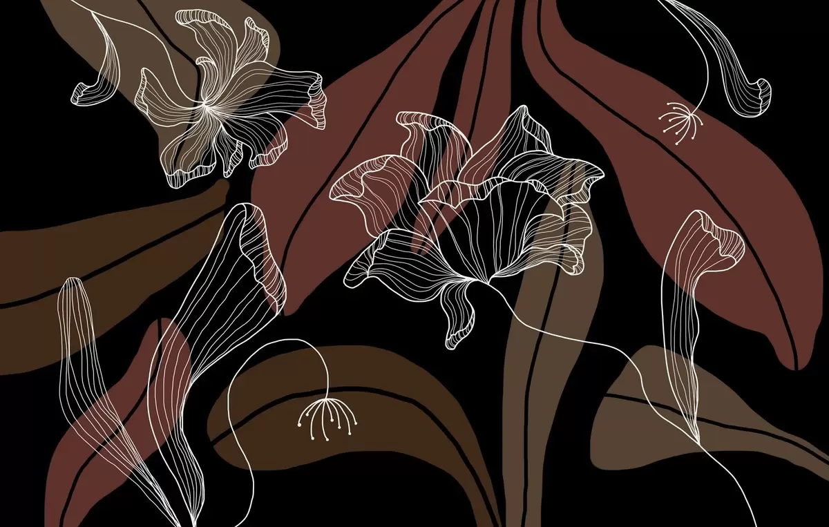 Valokuvatapetti abstraktit lehdet ja kukat jauhemaisissa ja beigeissä sävyissä tummalla taustalla Nr w04499v3