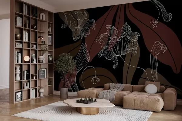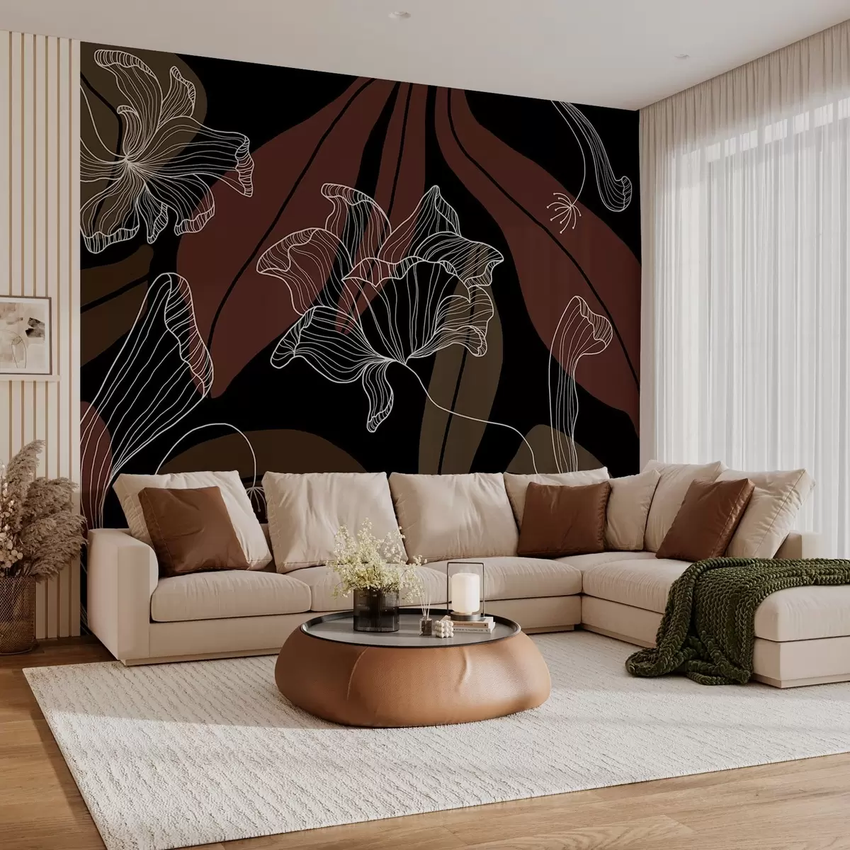 Valokuvatapetti abstraktit lehdet ja kukat jauhemaisissa ja beigeissä sävyissä tummalla taustalla Nr w04499v3
