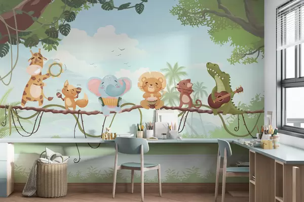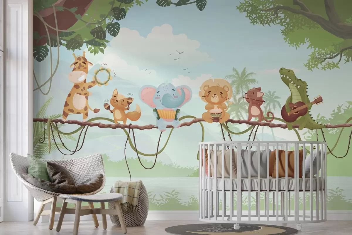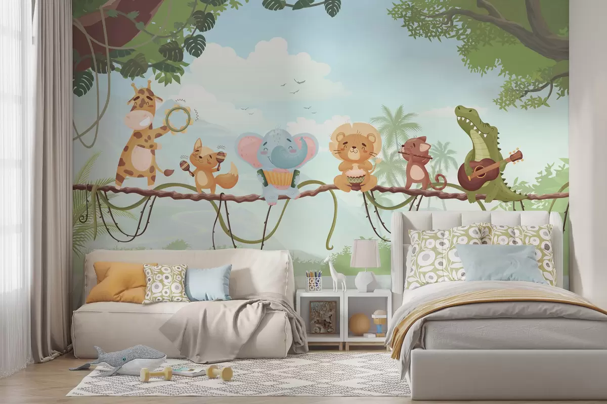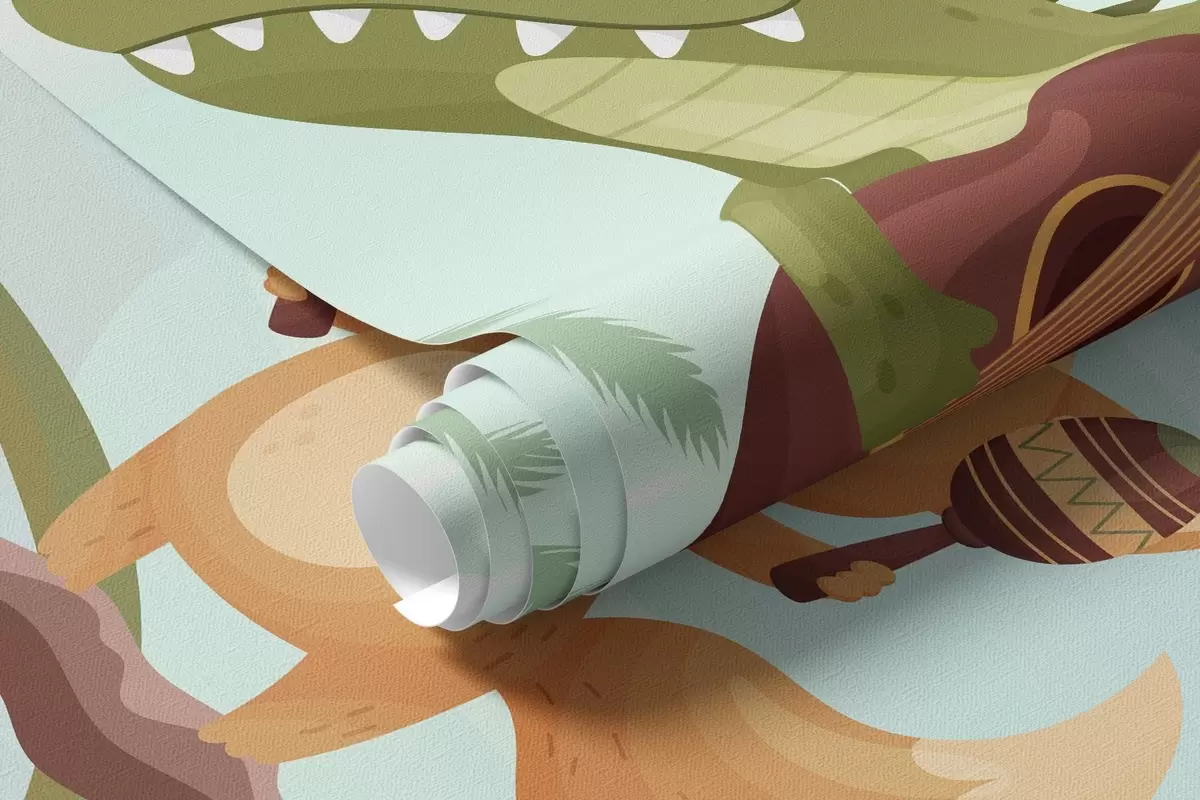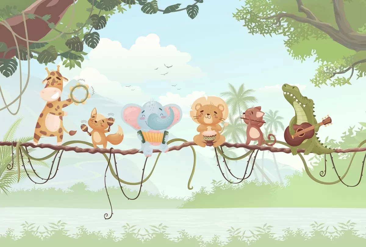 Valokuvatapetti Eläimet soittimineen trooppisen maiseman edessä Nr w04505