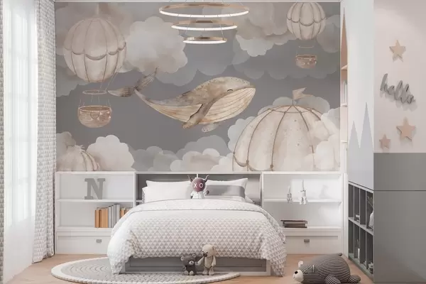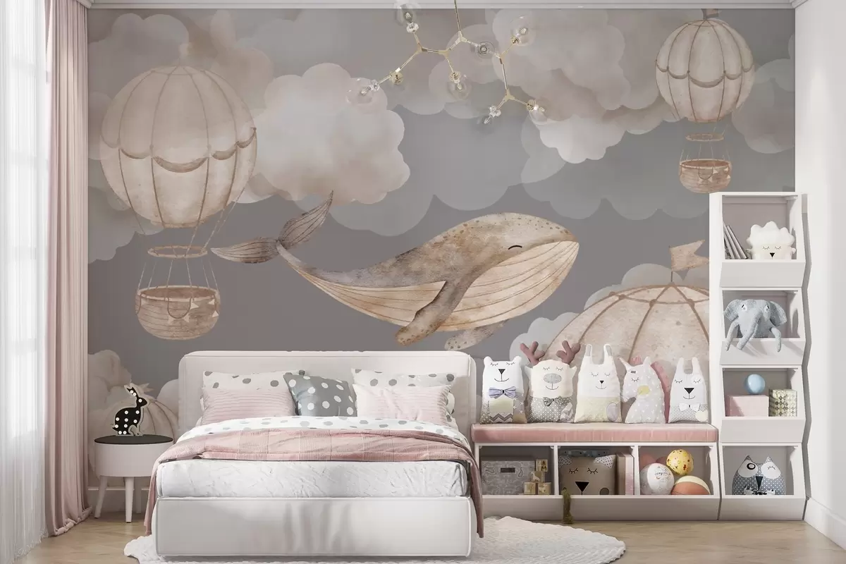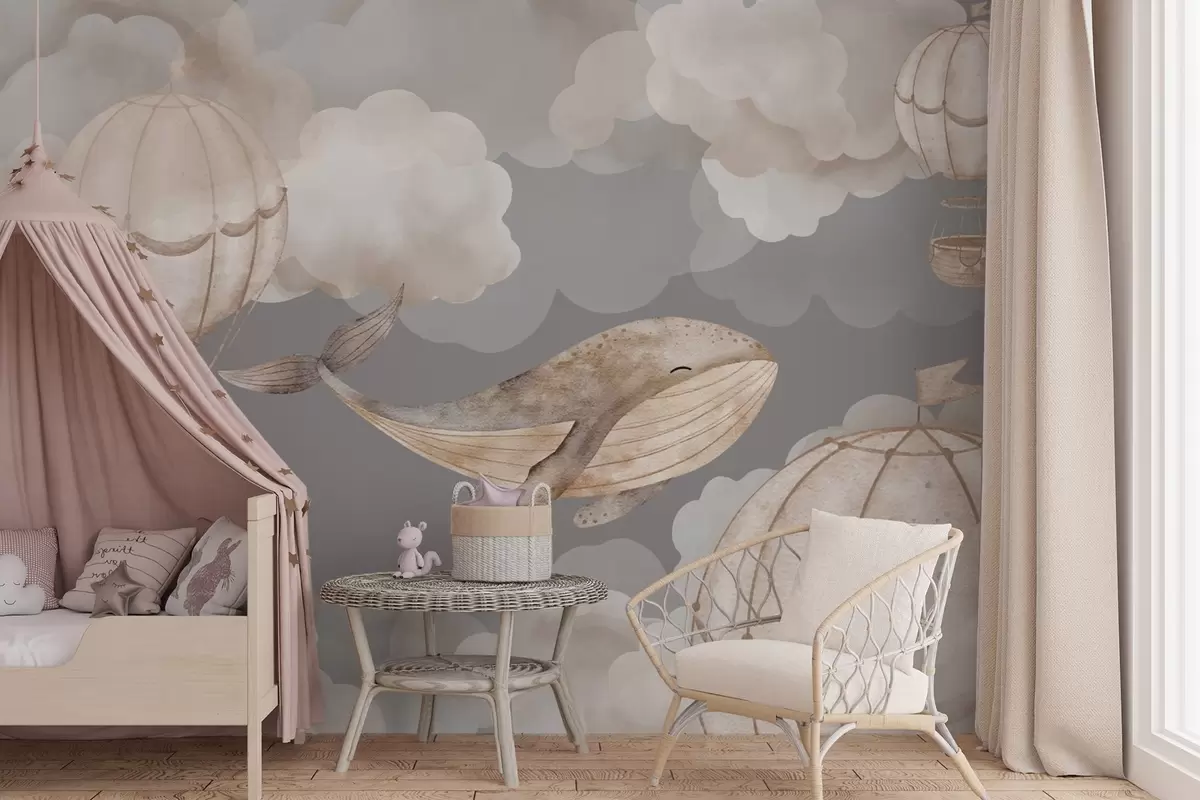 Valokuvatapetti Valas ja kuumailmapallot pehmeiden pilvien keskellä Nr w04522
