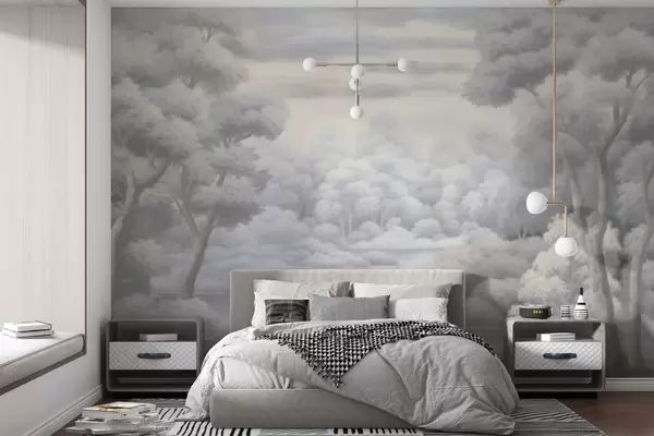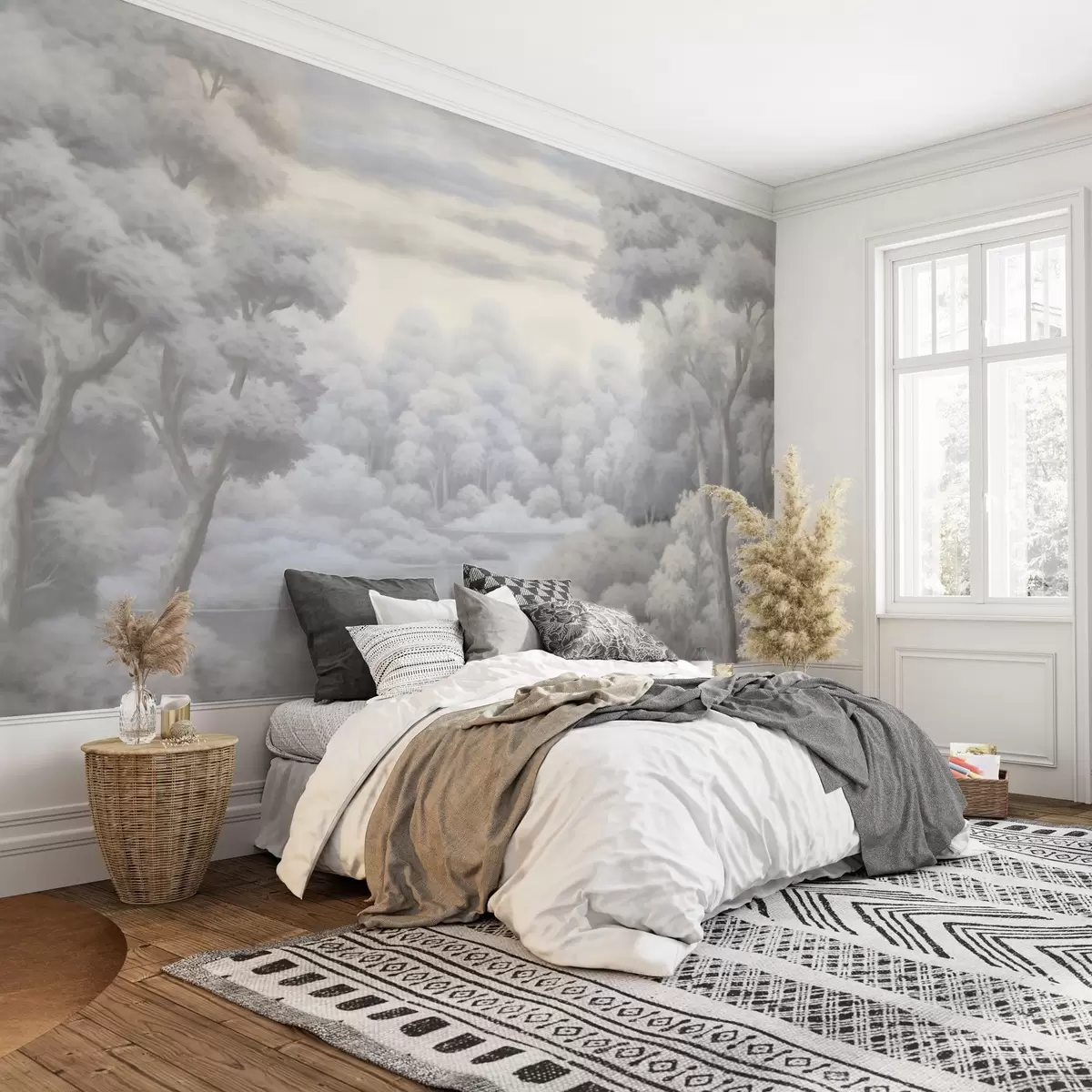 Valokuvatapetti Sumuiset metsät ja järvet pehmeissä harmaissa sävyissä Nr w04617