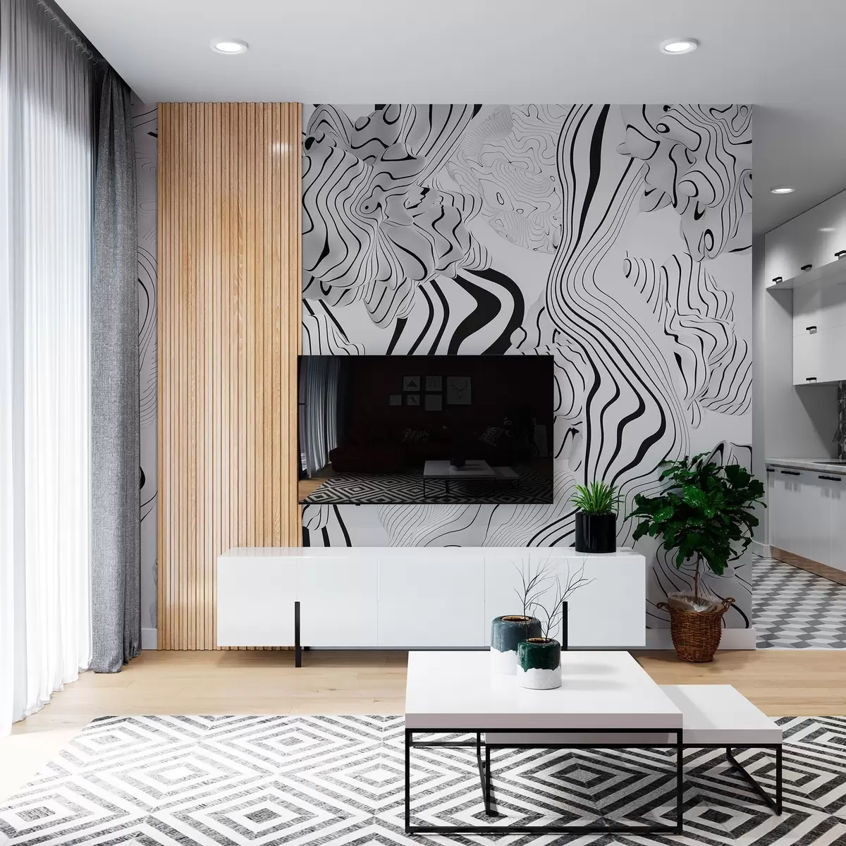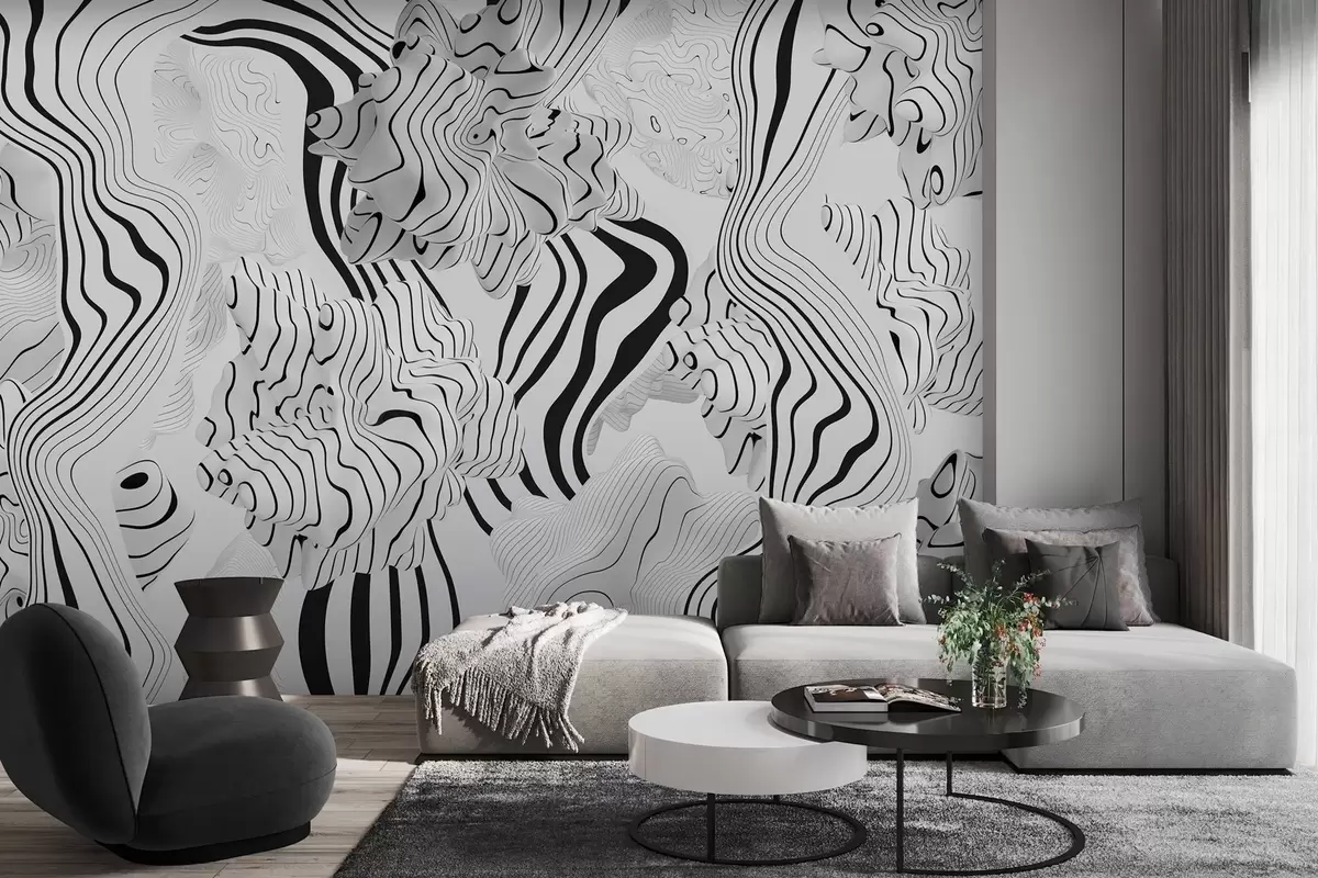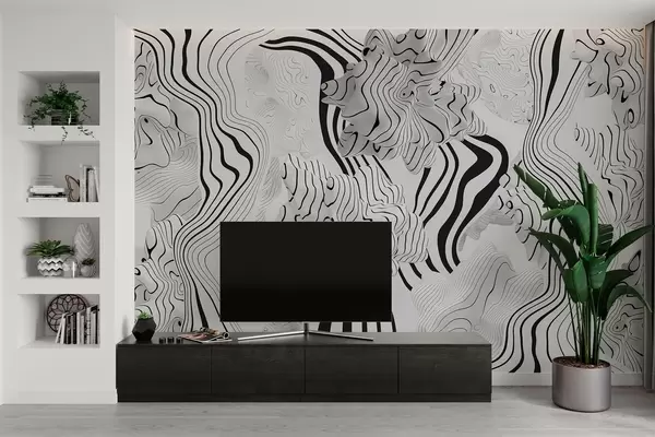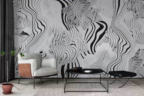 Valokuvatapetti abstraktit orgaaniset muodot 3D-tyylillä valkoisissa ja harmaissa sävyissä mustilla raidoilla Nr w04627