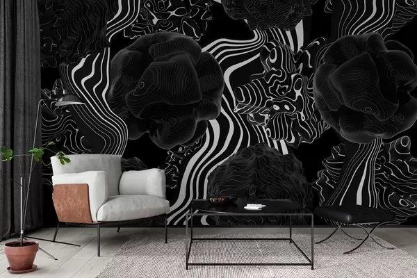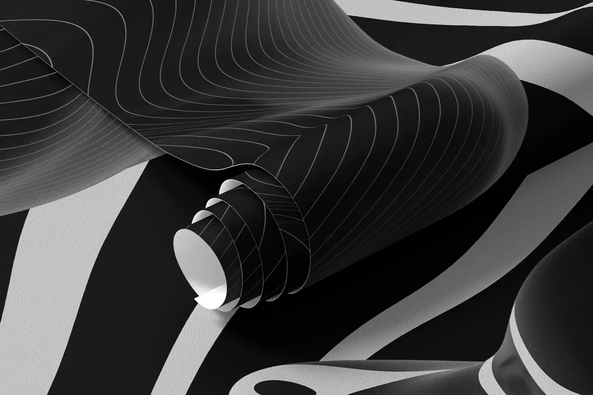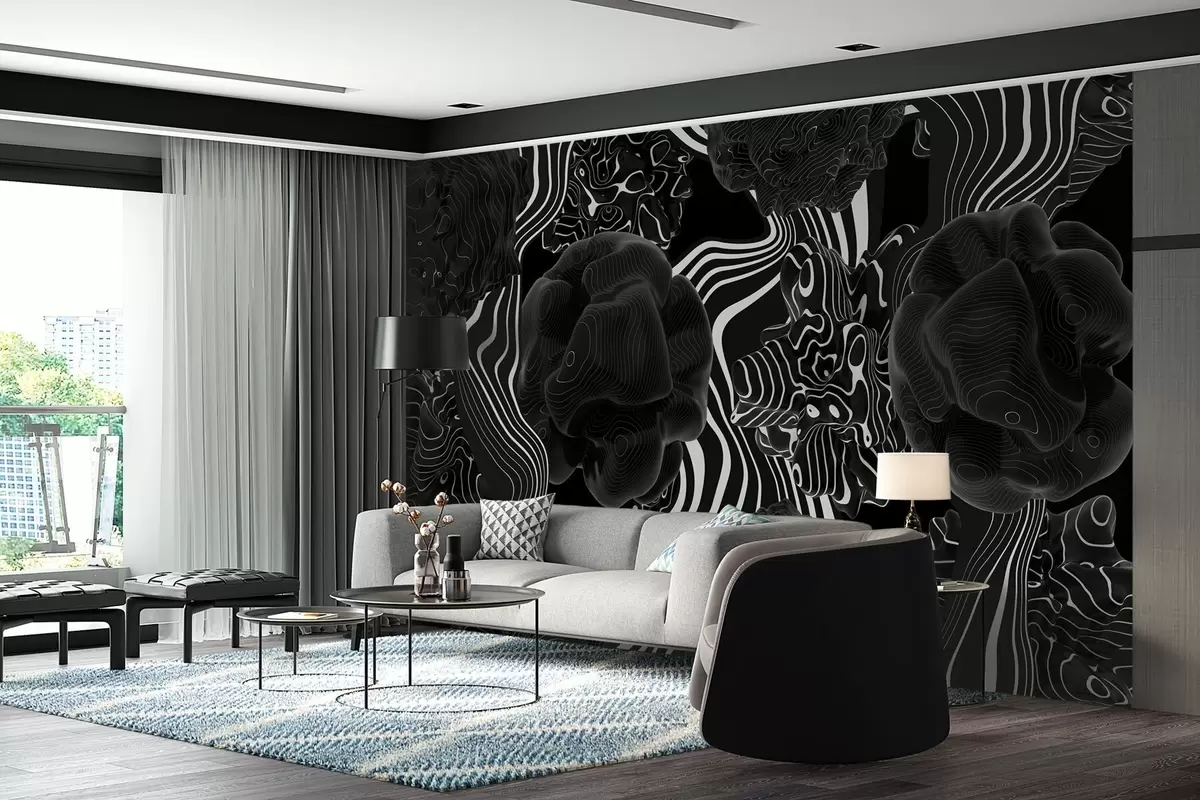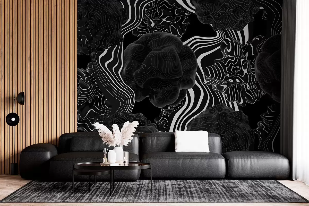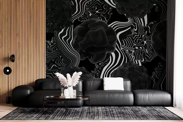 Valokuvatapetti abstraktit orgaaniset muodot 3D-tyylillä mustissa sävyissä valkoisilla raidoilla Nr w04628