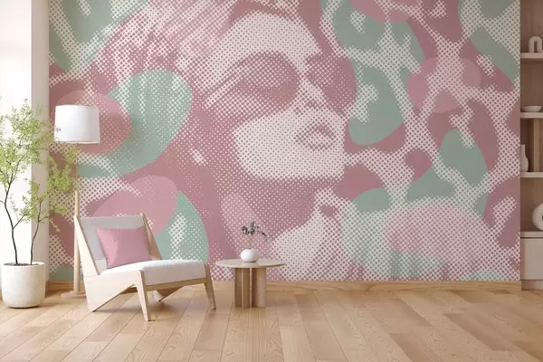 Valokuvatapetti naisen muotokuva leopardikuvioisella taustalla, pisteviivatyylillä, vaaleanpunaisilla ja vihreillä sävyillä Nr w04630v2