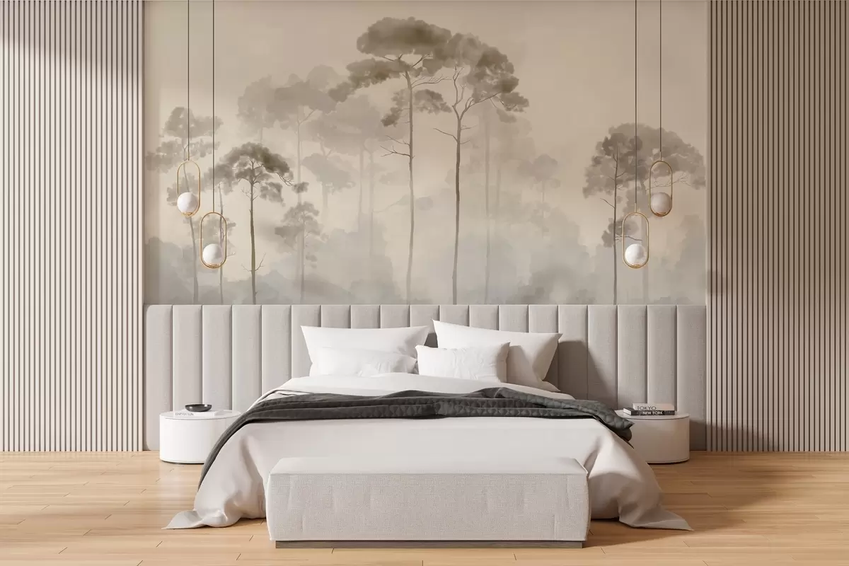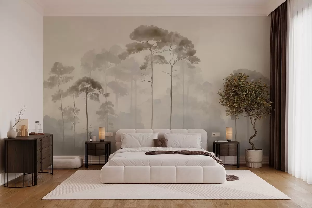 Valokuvatapetti vaaleat mäntyjen siluetit vesiväri-tyylillä Nr w04634