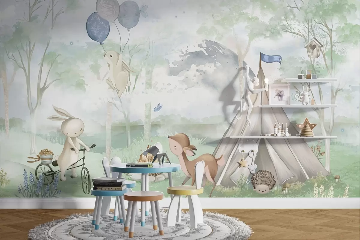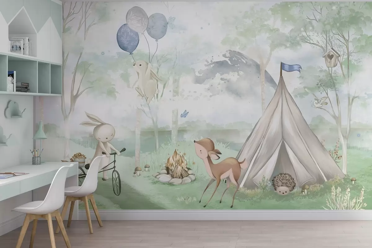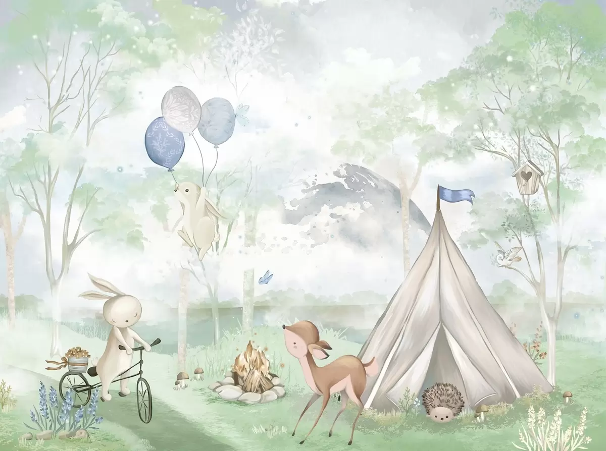 Valokuvatapetti Lasten metsäleiri: puput, kauris, teltta ja nuotio Nr w04671v1