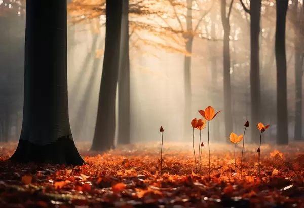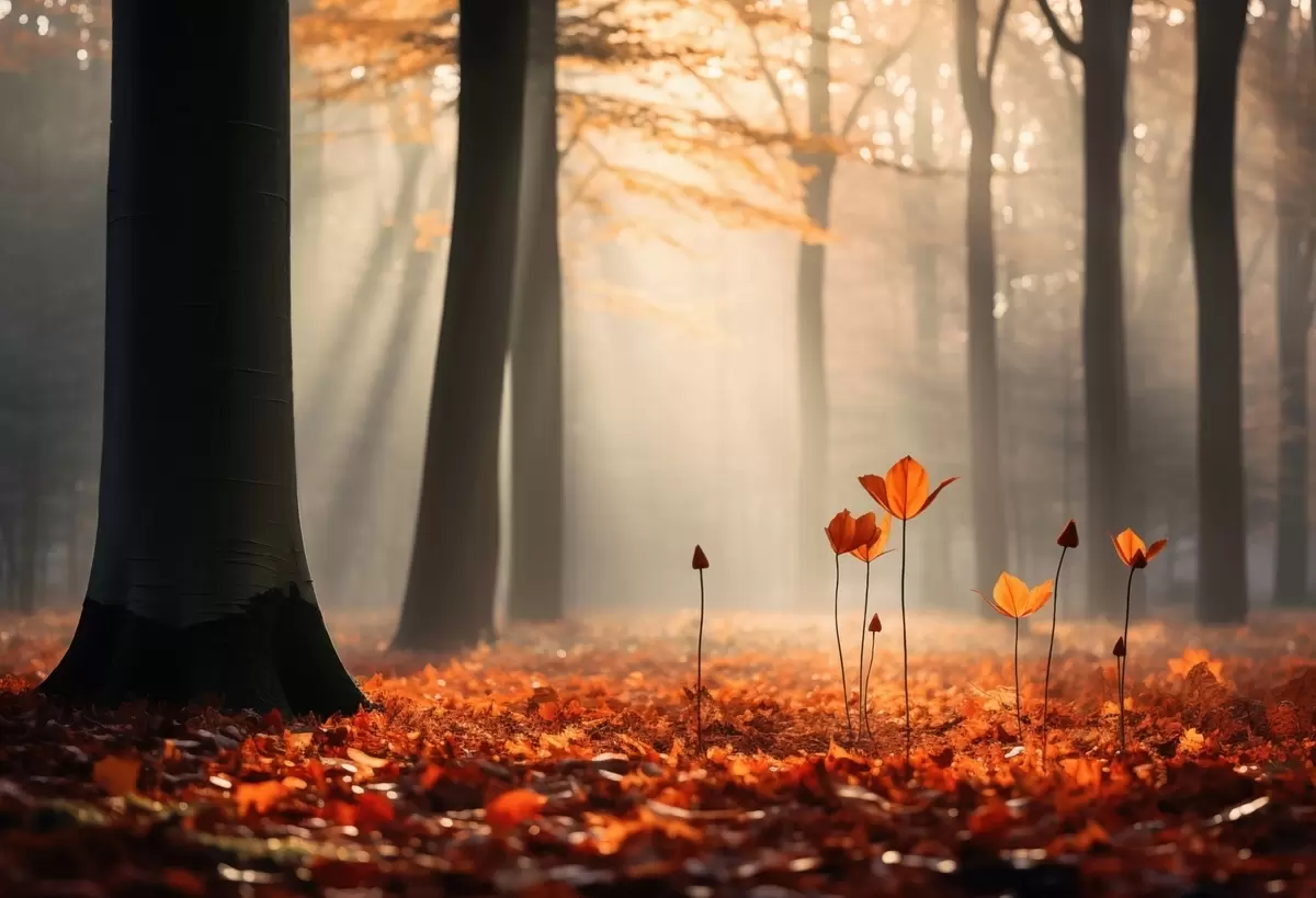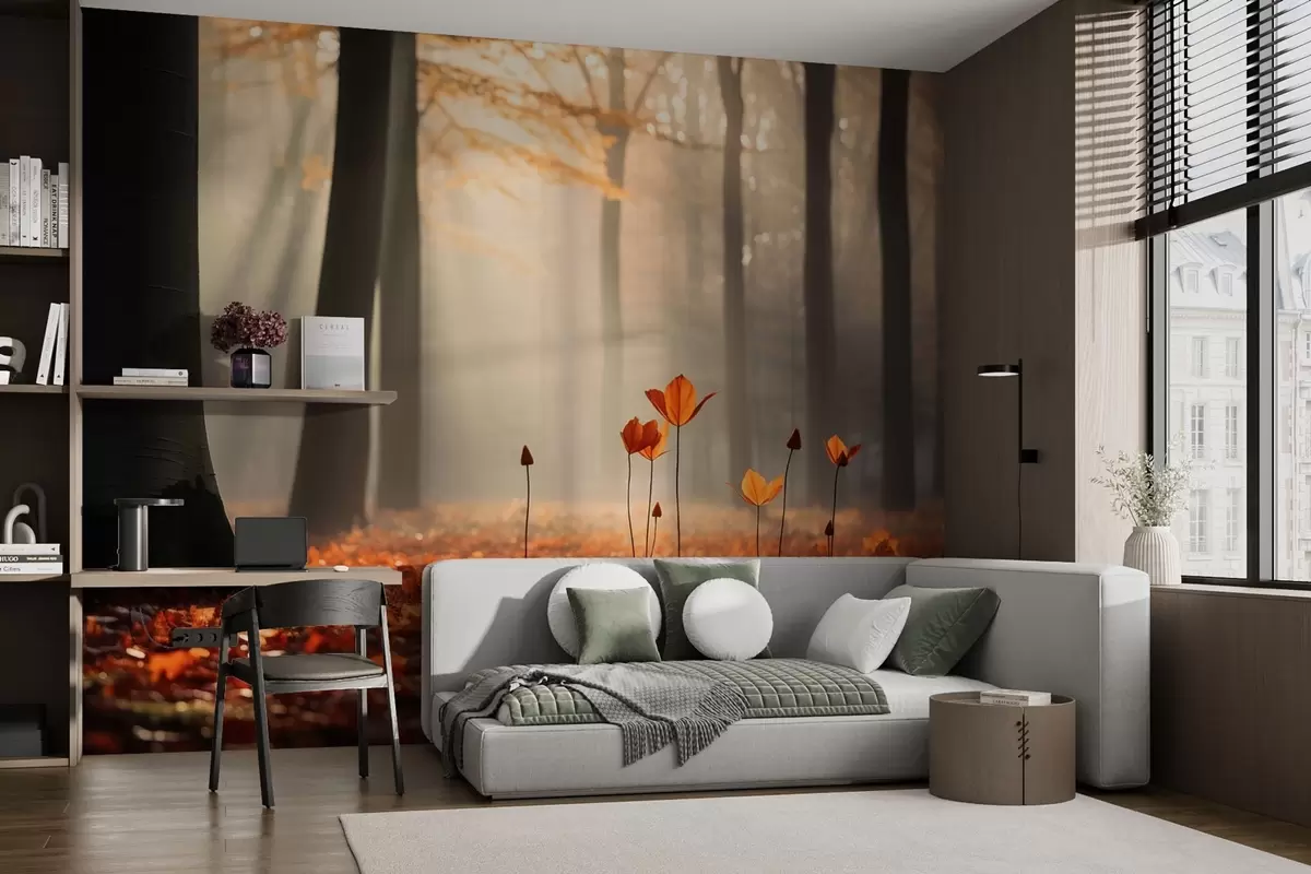 Valokuvatapetti Syksyinen metsä auringon säteiden ja kirkkaan lehtien keskellä Nr w04710
