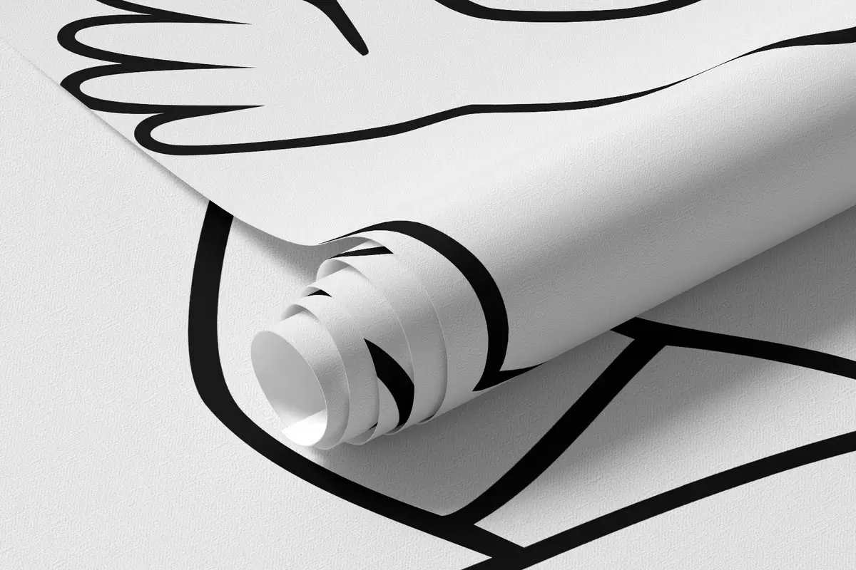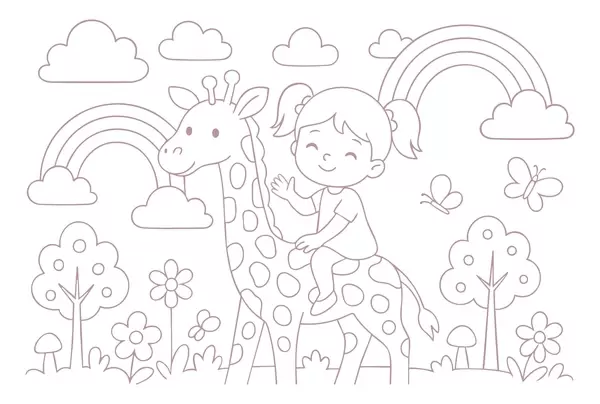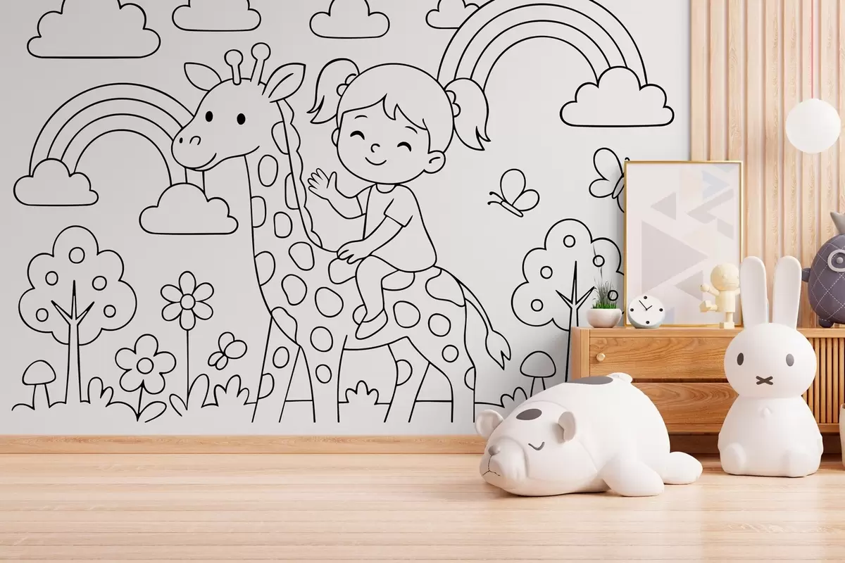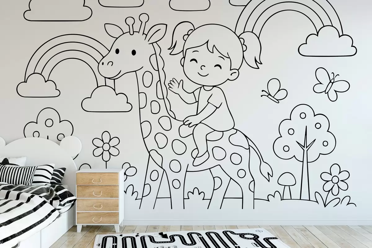 Valokuvatapetti mustavalkoinen piirros tytöstä kirahvin selässä, lasten värityskirjan tyylinen Nr w04753