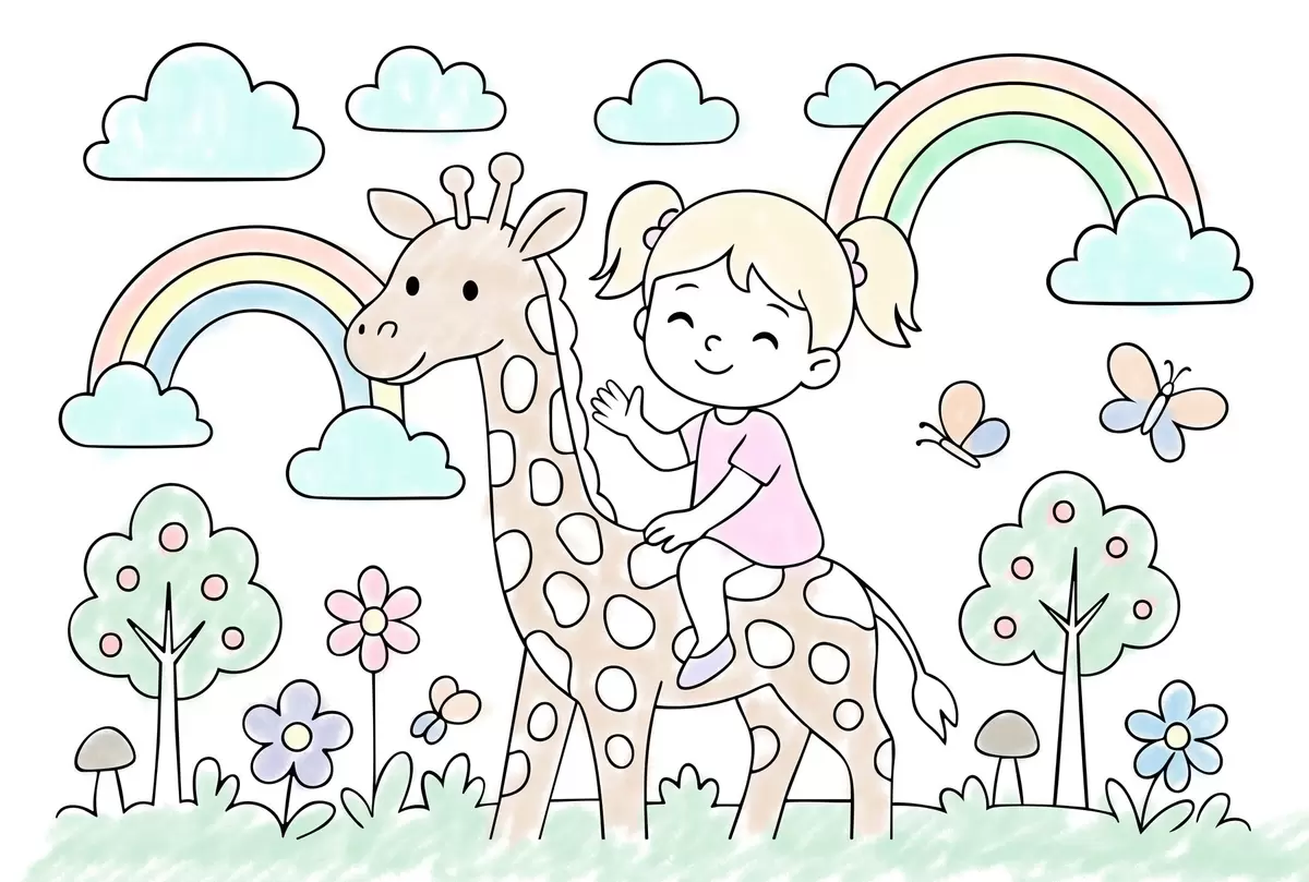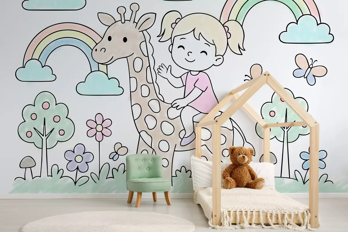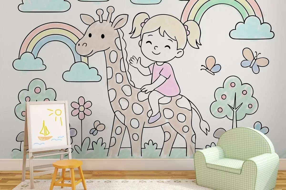 Valokuvatapetti tyttö kirahvin selässä lasten värityskirjan tyylillä Nr w04755