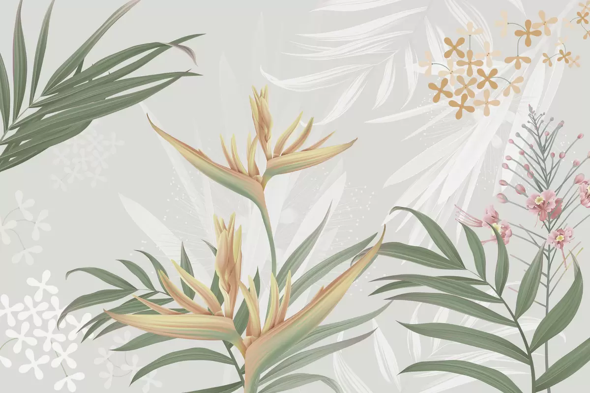 Valokuvatapetti Eksoottiset Strelitzia-kukat lehtien seassa Nr w04783