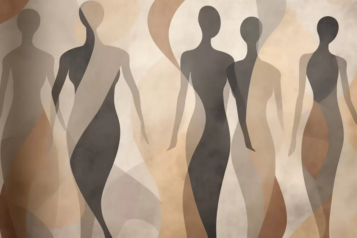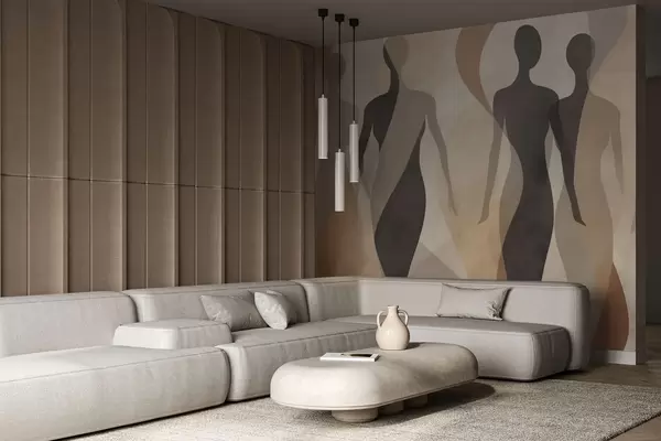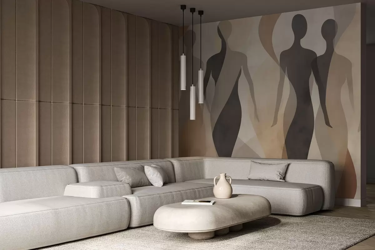 Valokuvatapetti Silhuettihahmot ja pehmeät aallot lämpimissä beige-harmaissa sävyissä Nr w04787