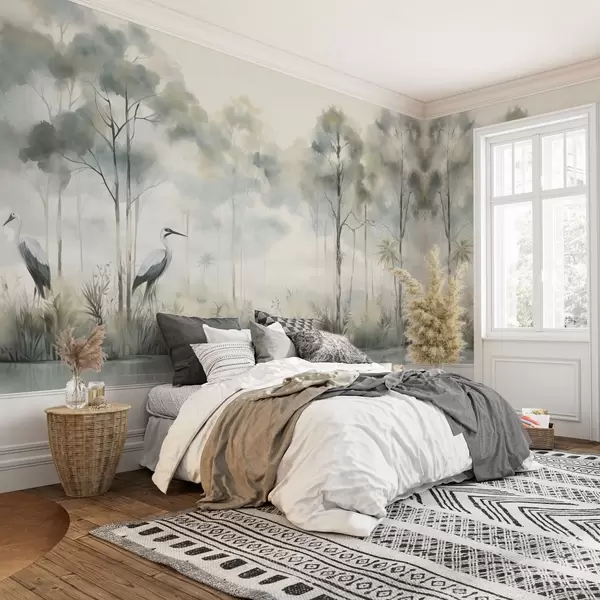 Valokuvatapetti Sumuinen metsä veden äärellä, jossa on haikaroita, pehmeä viileä väripaletti Nr w04788