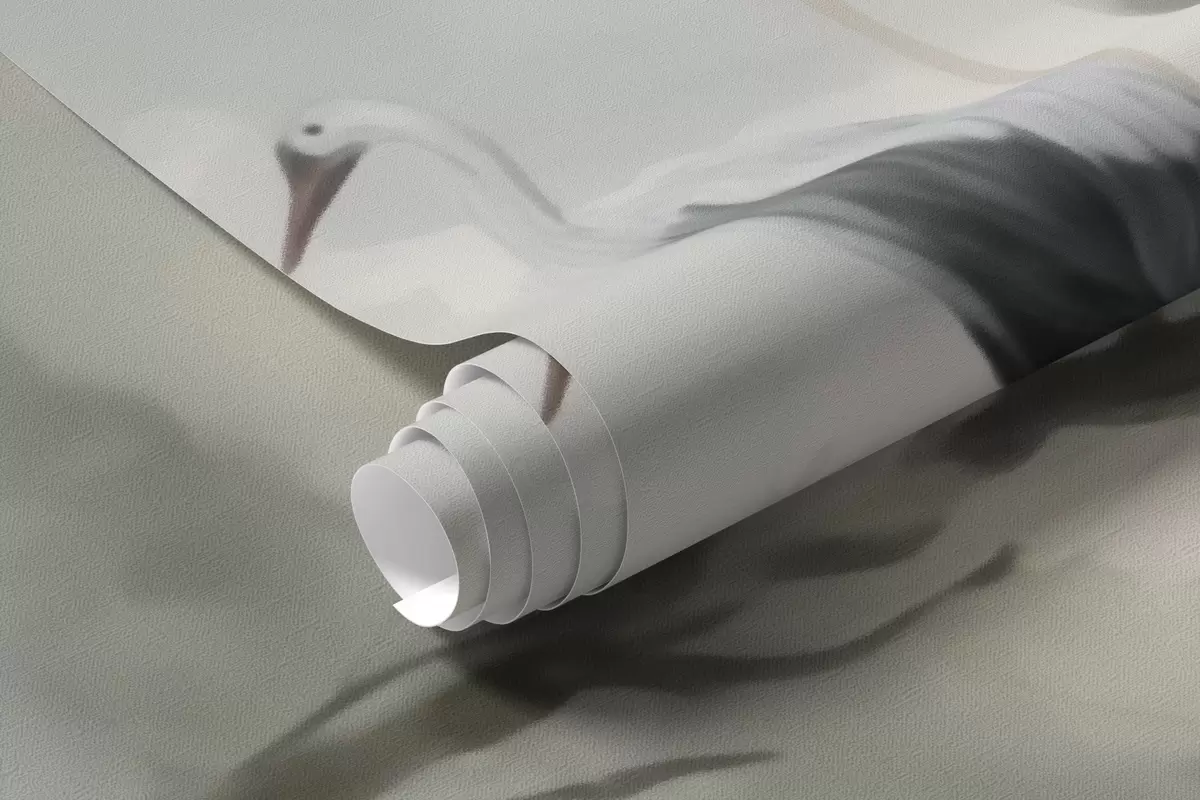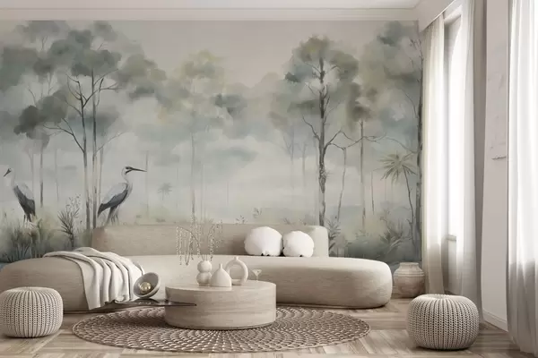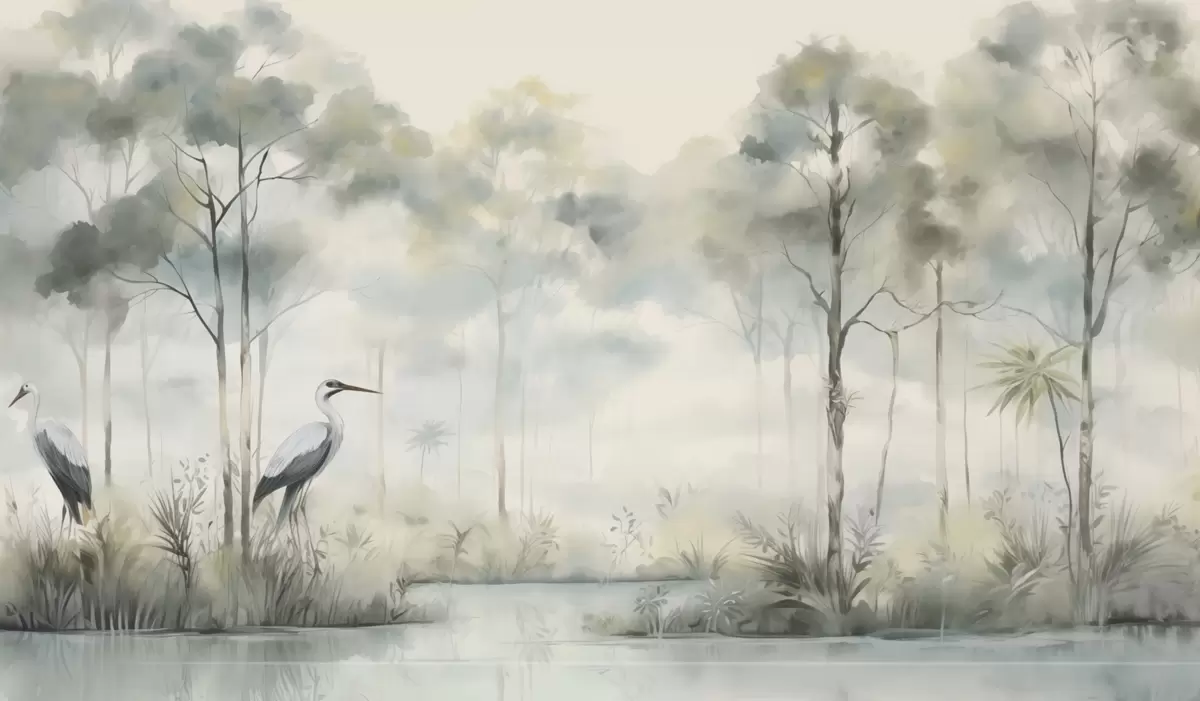 Valokuvatapetti Sumuinen metsä veden äärellä, jossa on haikaroita, pehmeä viileä väripaletti Nr w04788