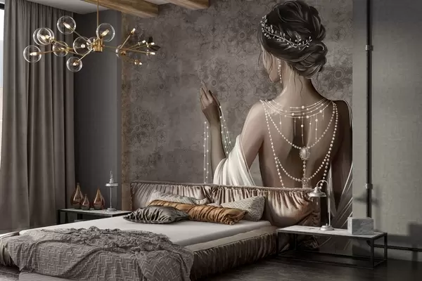 Valokuvatapetti Nainen takaa katsottuna, helmiä, harmaa kivikuvioinen tausta Nr w04854