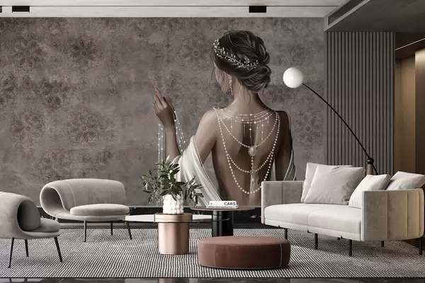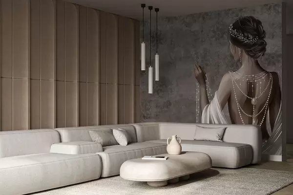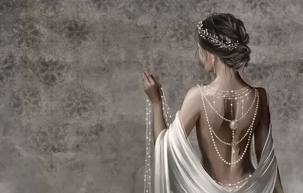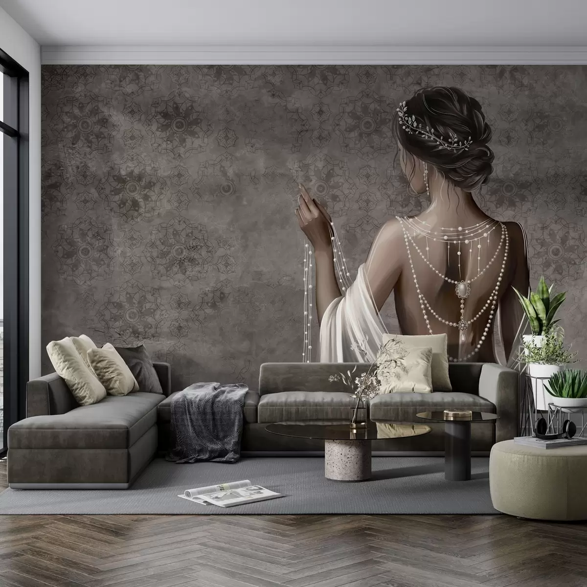 Valokuvatapetti Nainen takaa katsottuna, helmiä, harmaa kivikuvioinen tausta Nr w04854