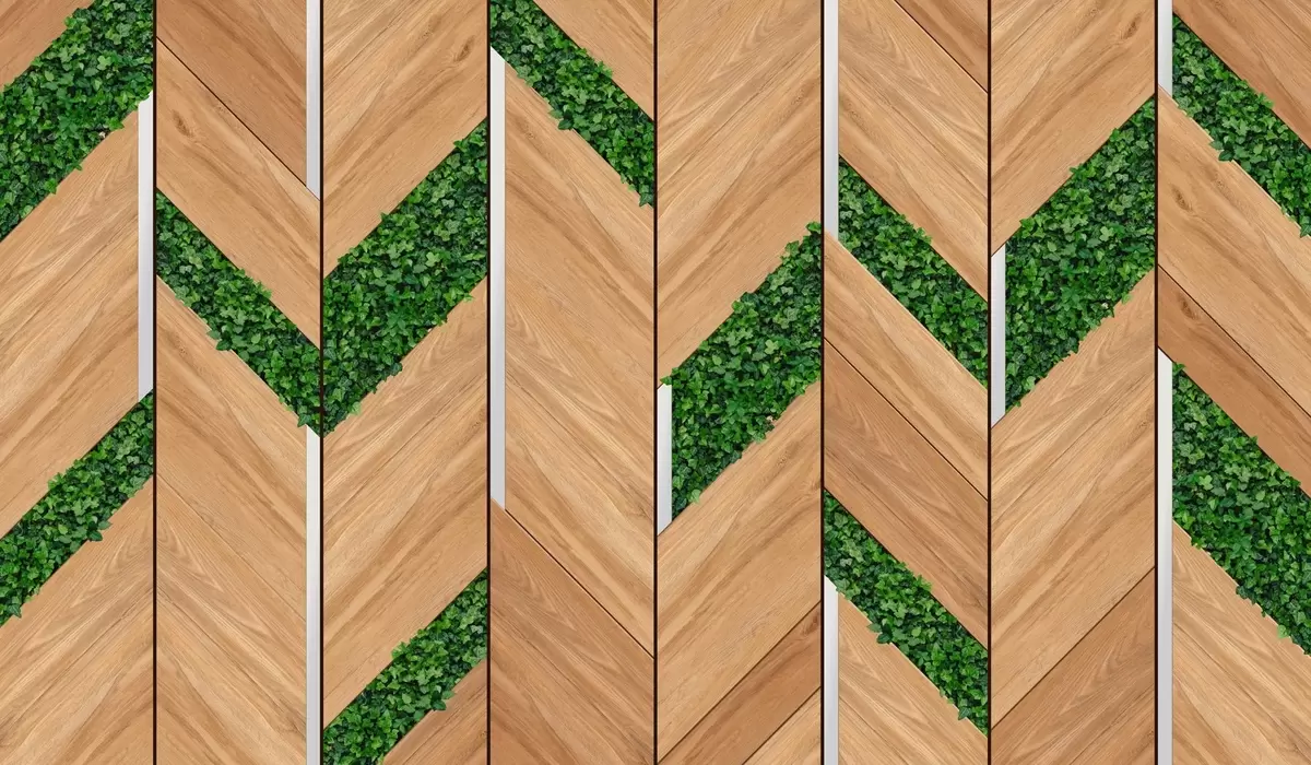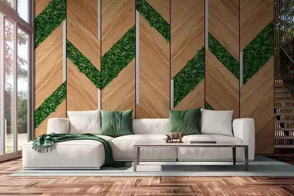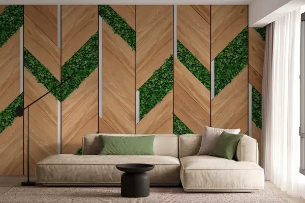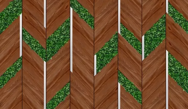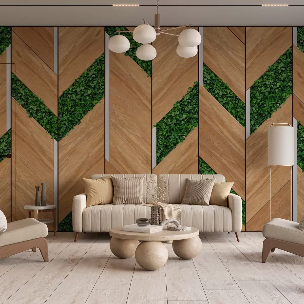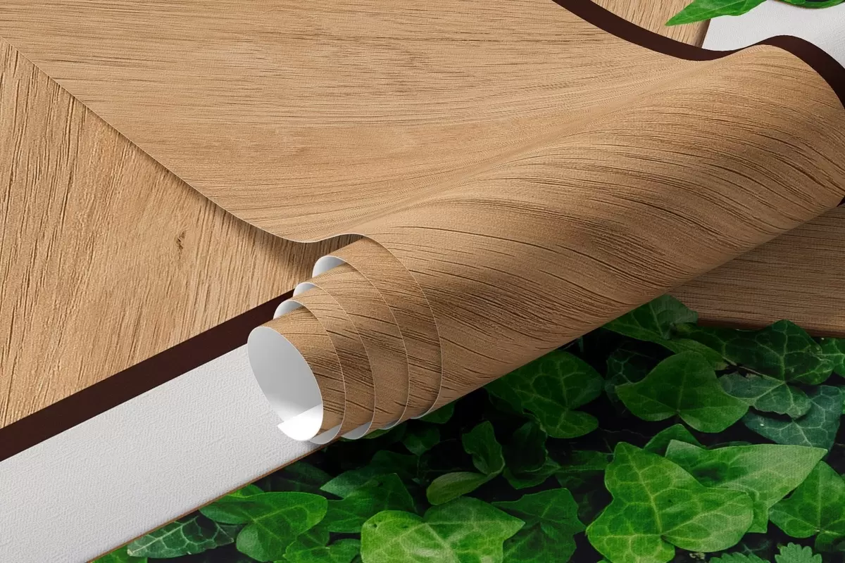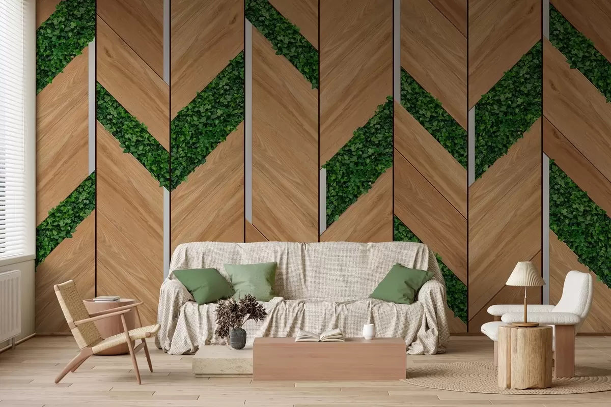 Valokuvatapetti kevyiden puupaneelien jäljitelmä kasvien lisäosilla Nr w04875