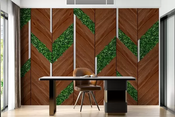 Valokuvatapetti tumman puupaneelin jäljitelmä kasvien koristeilla Nr w04875v1