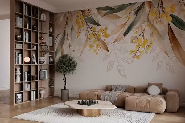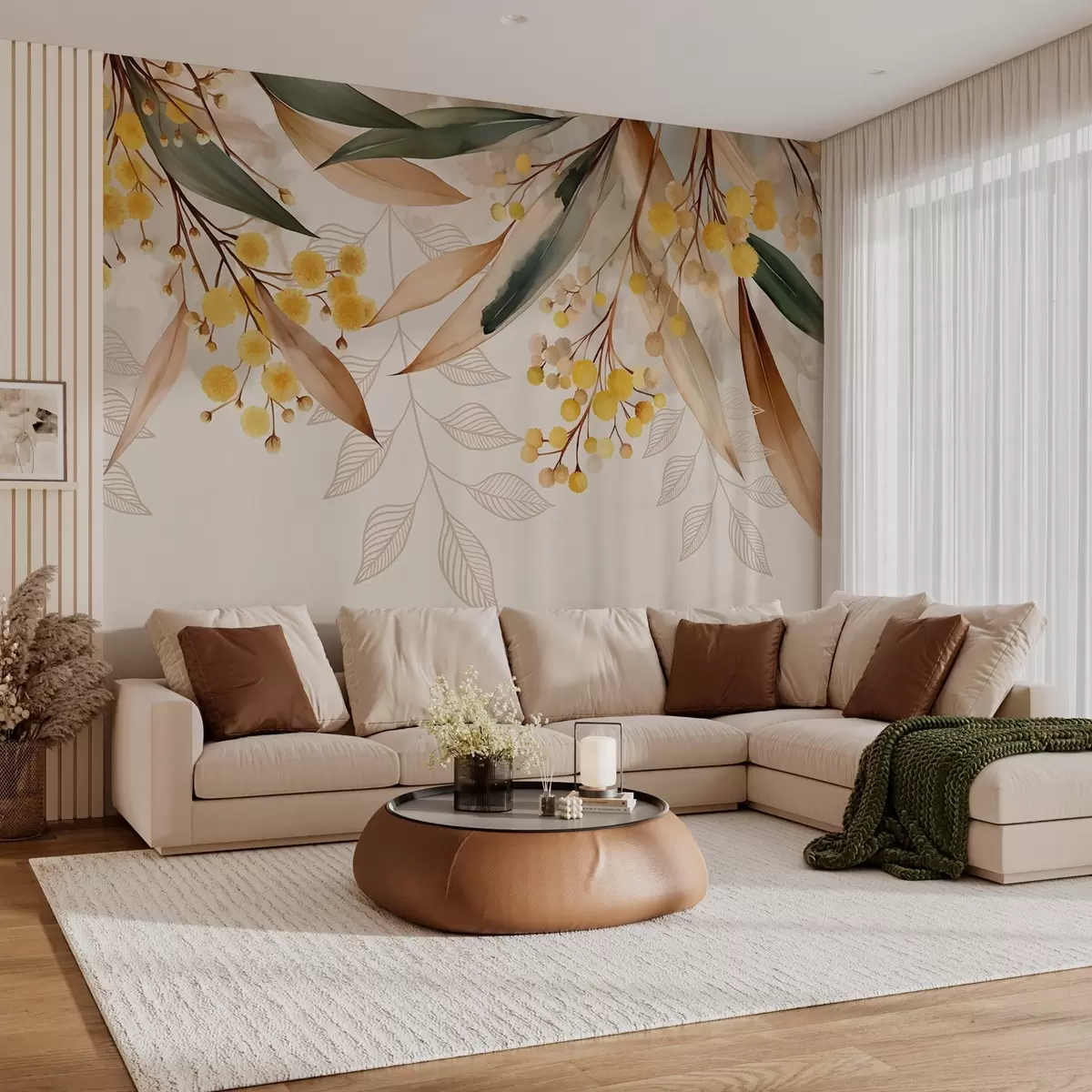 Valokuvatapetti vesiväri-tyyliset kukat ja lehdet, jotka putoavat ylhäältä alas Nr w04880