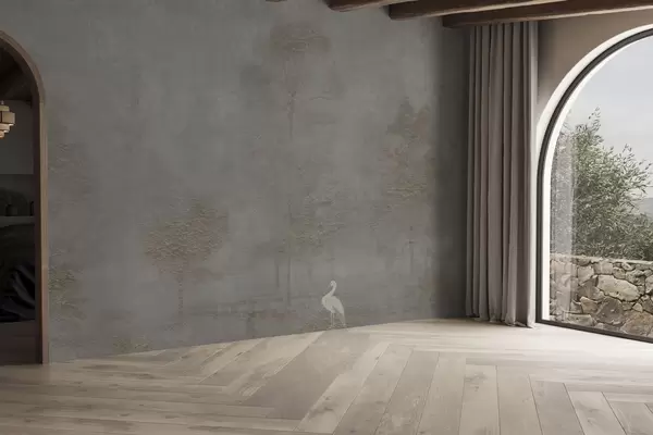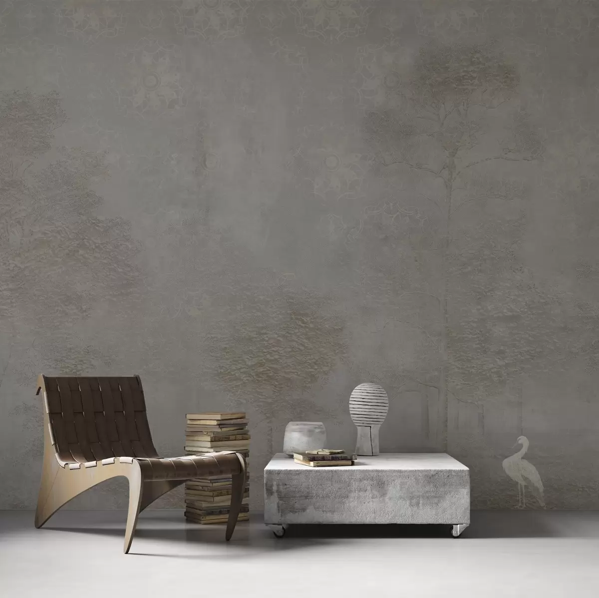 Valokuvatapetti Sumuisessa metsässä on haikara ja sen yläpuolella koristeellinen kuvio Nr w04953v1