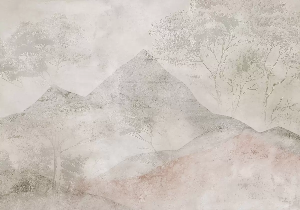Valokuvatapetti Pehmeät pastellivärit vuoret ja puut kevyessä sumussa Nr w04954