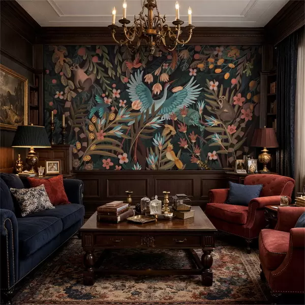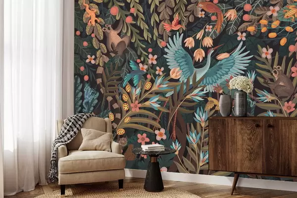 Valokuvatapetti Fantasiakohtaus, jossa lintuja ja eläimiä kasvien keskellä Nr w05024