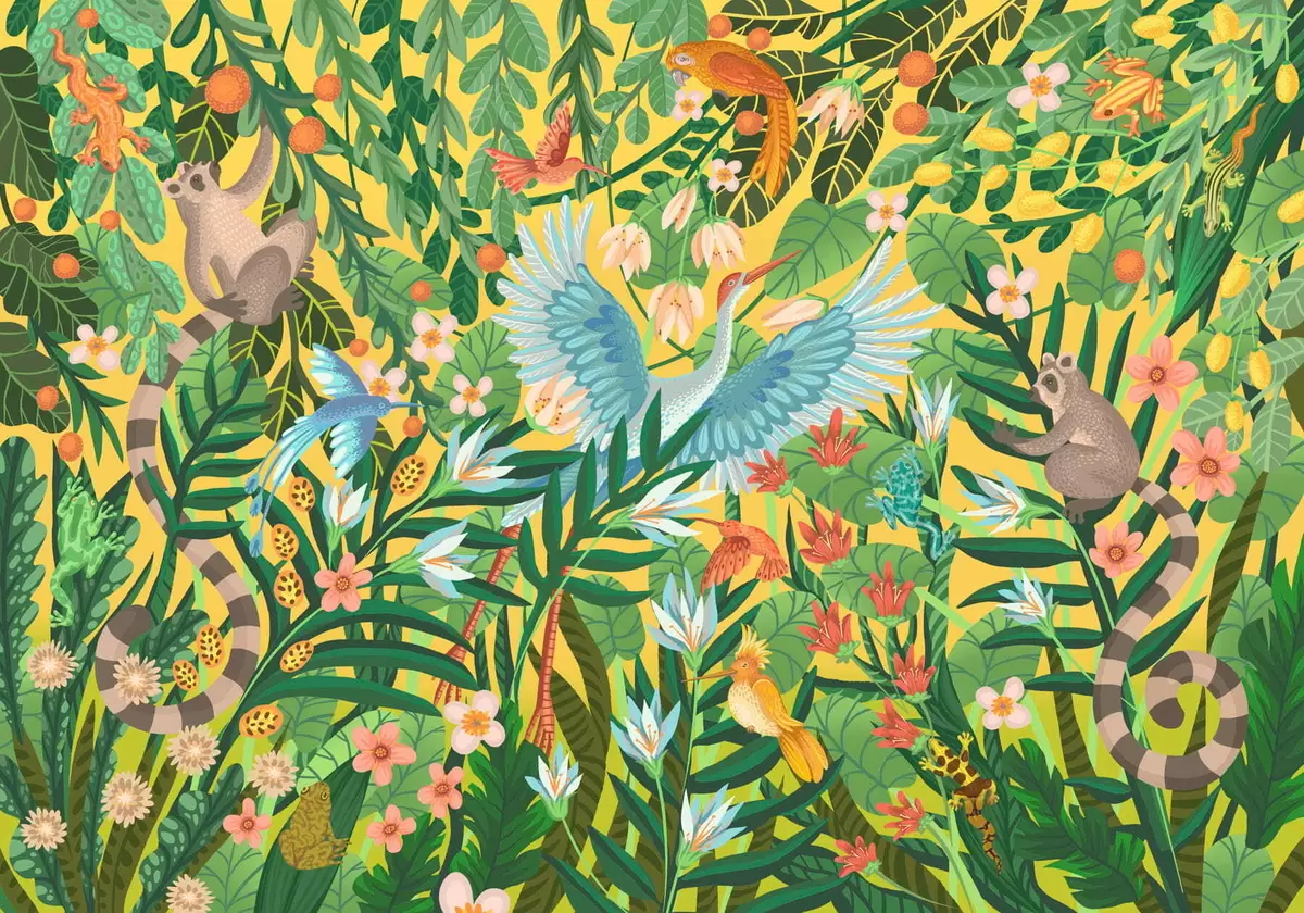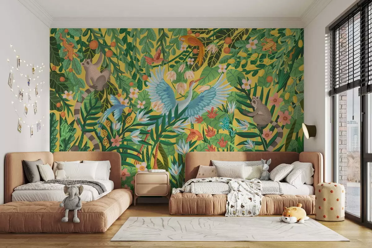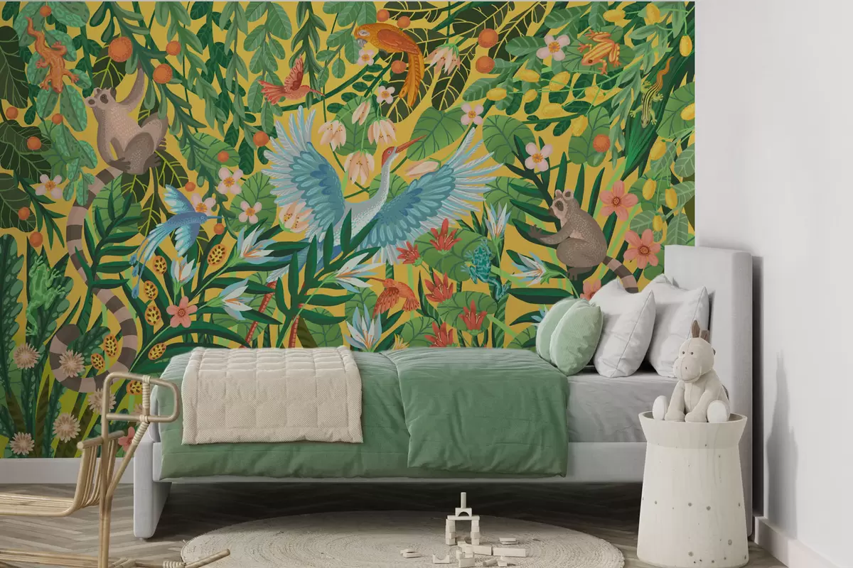 Valokuvatapetti Kirkas kohtaus, jossa lintuja ja eläimiä tiheässä vehreydessä Nr w05024v1