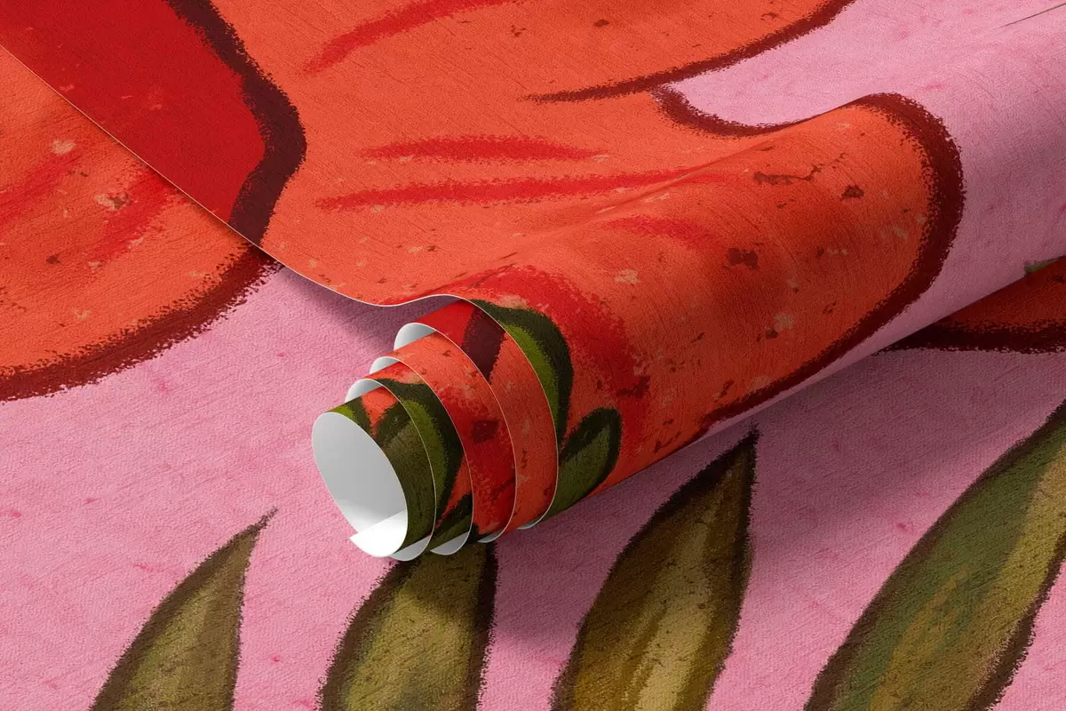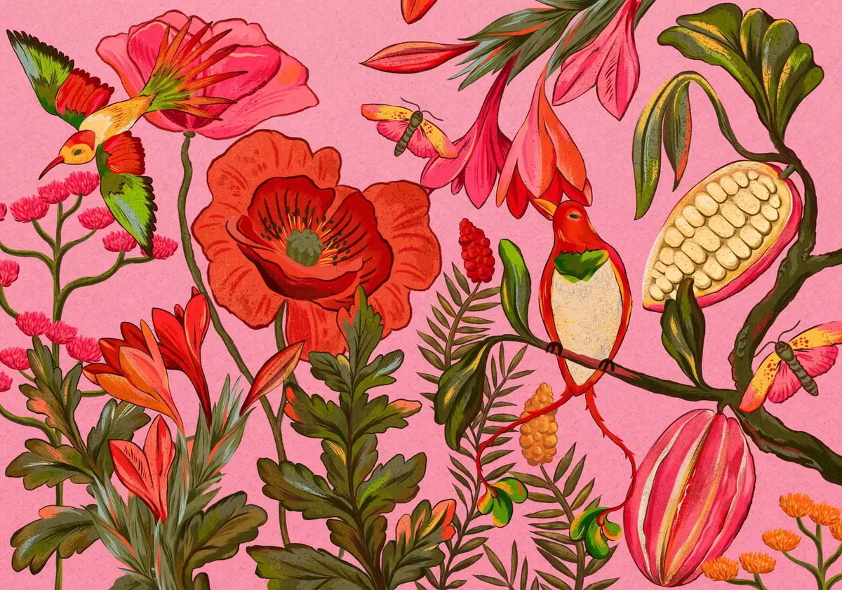 Valokuvatapetti Koristeelliset kukat ja linnut vaaleanpunaisella taustalla Nr w05036v2