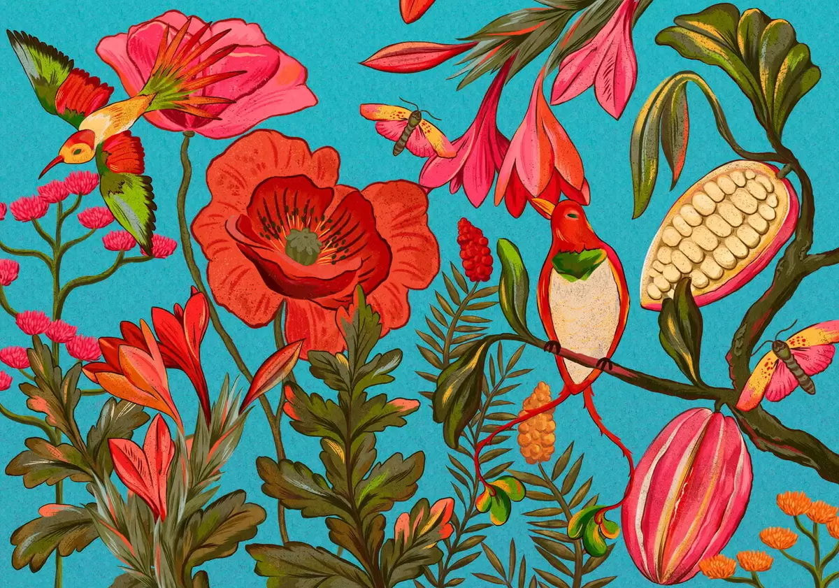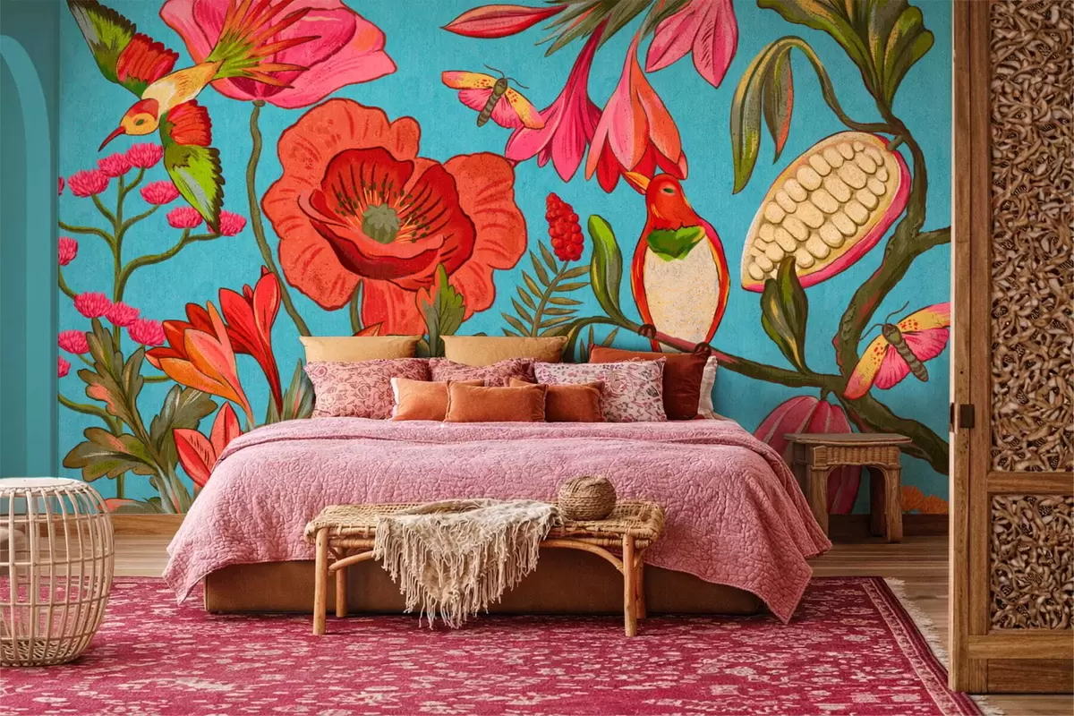 Valokuvatapetti Koristeelliset kukat ja linnut sinisellä taustalla Nr w05036v3