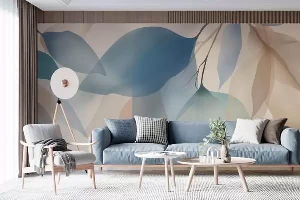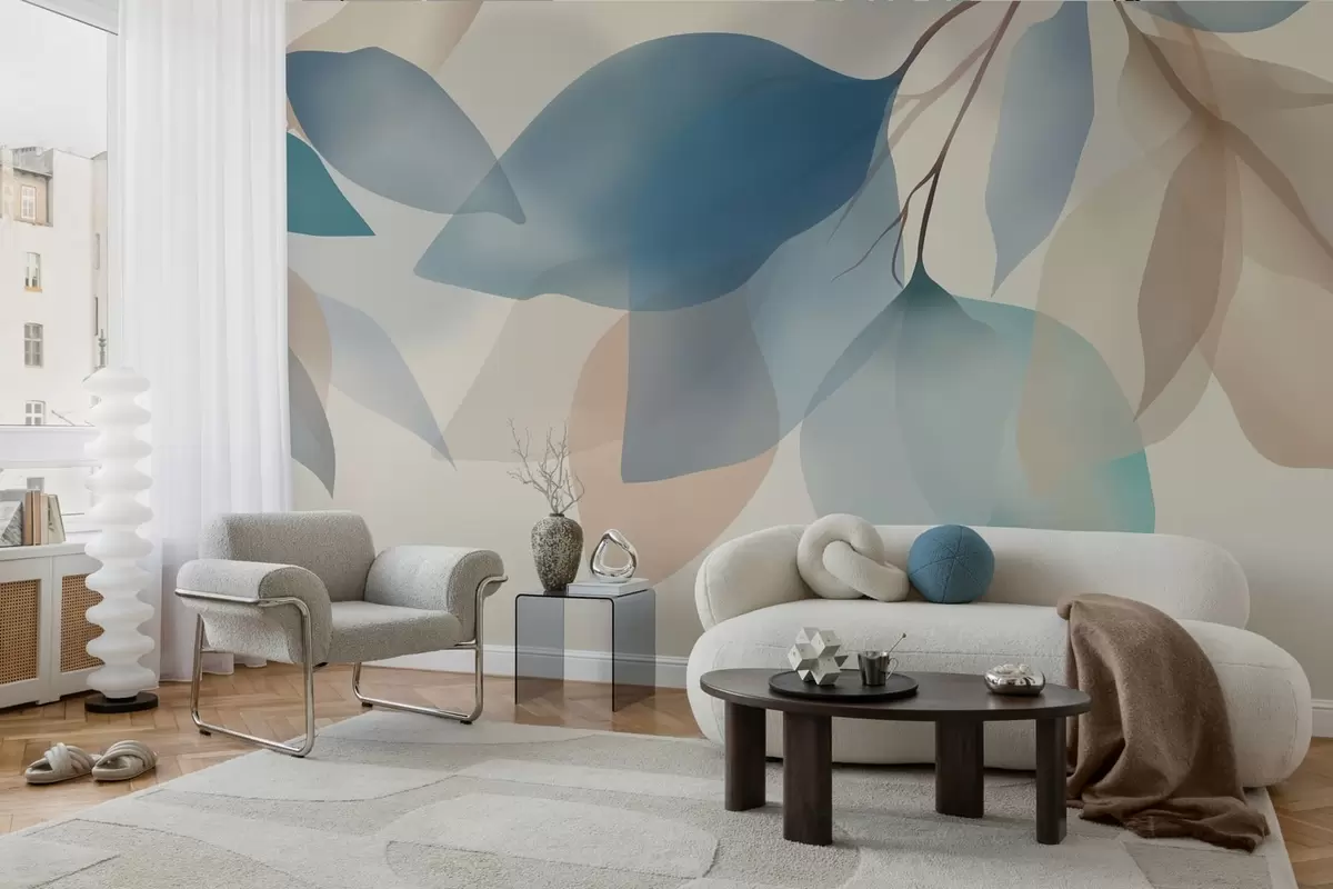 Valokuvatapetti tyylikkäät puoliläpinäkyvät lehdet sinisen ja beigen sävyissä Nr w05060