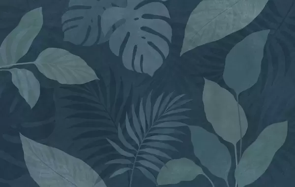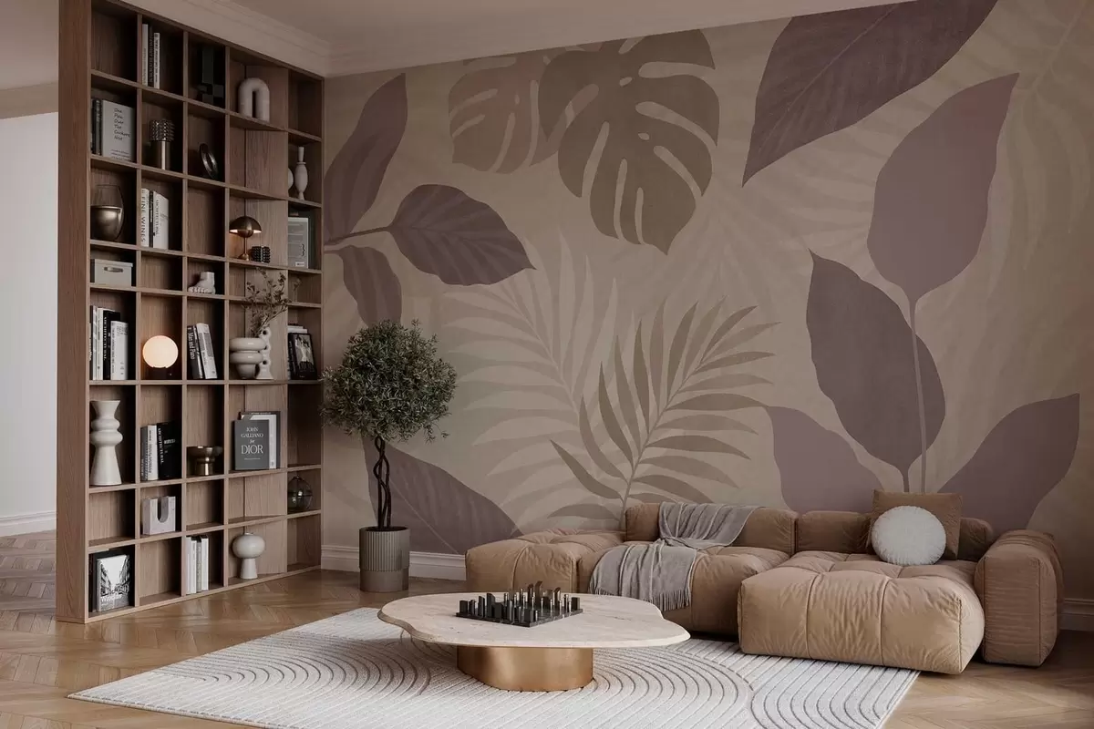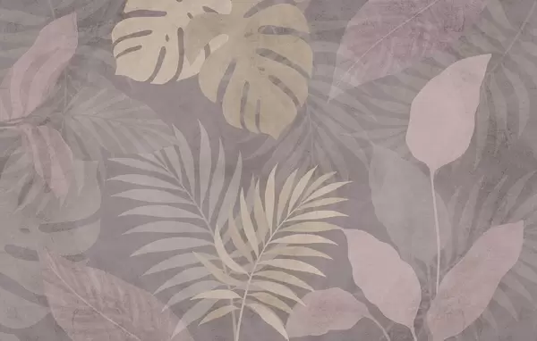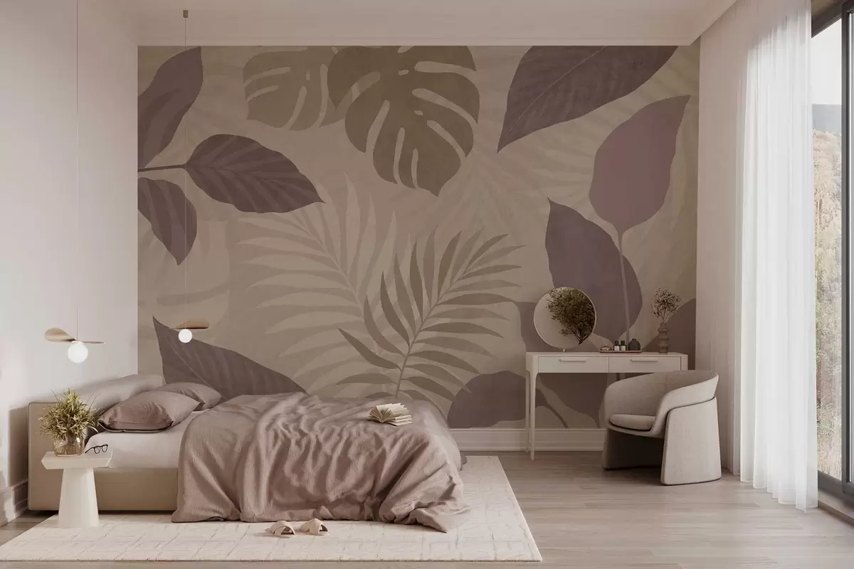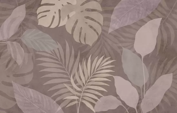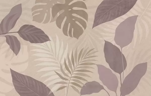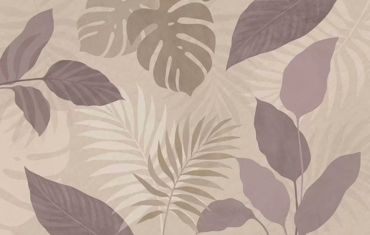Valokuvatapetti kuvioidut trooppiset lehdet hiekkaisella taustalla Nr w05063