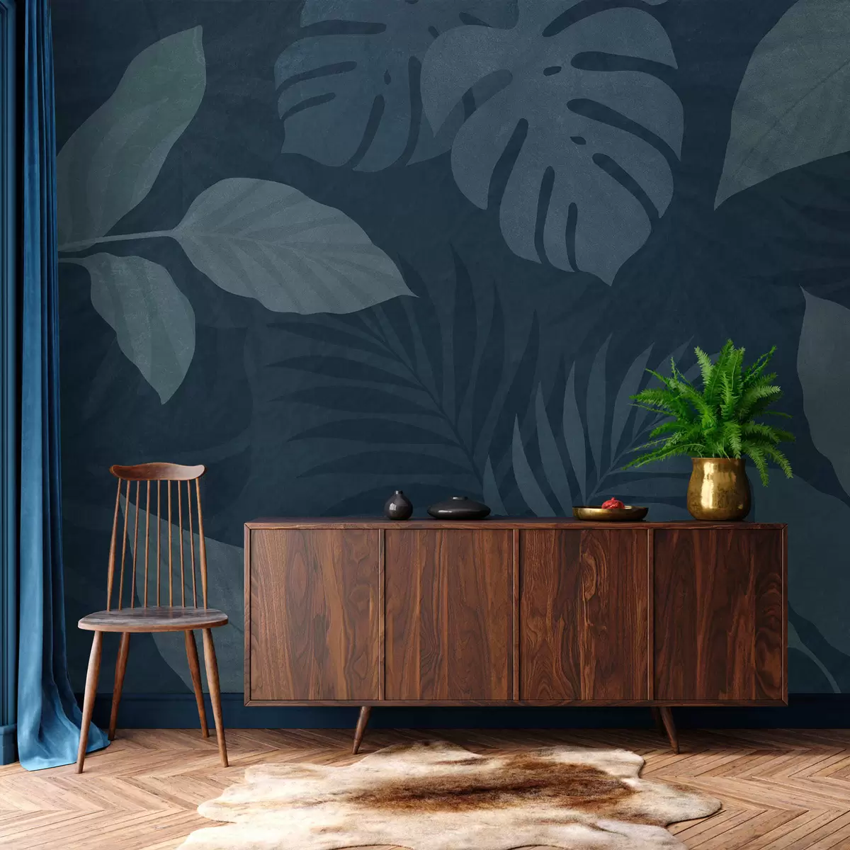 Valokuvatapetti kuvioidut trooppiset lehdet tummansinisellä taustalla Nr w05063v3
