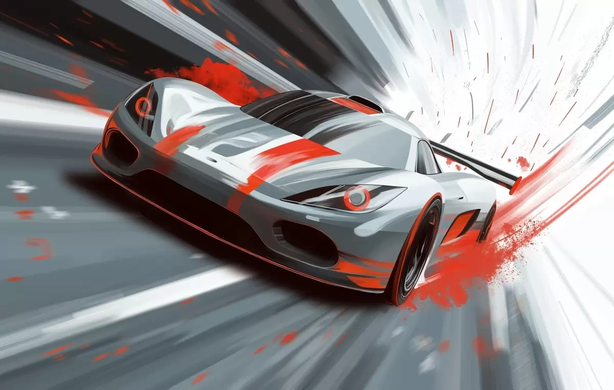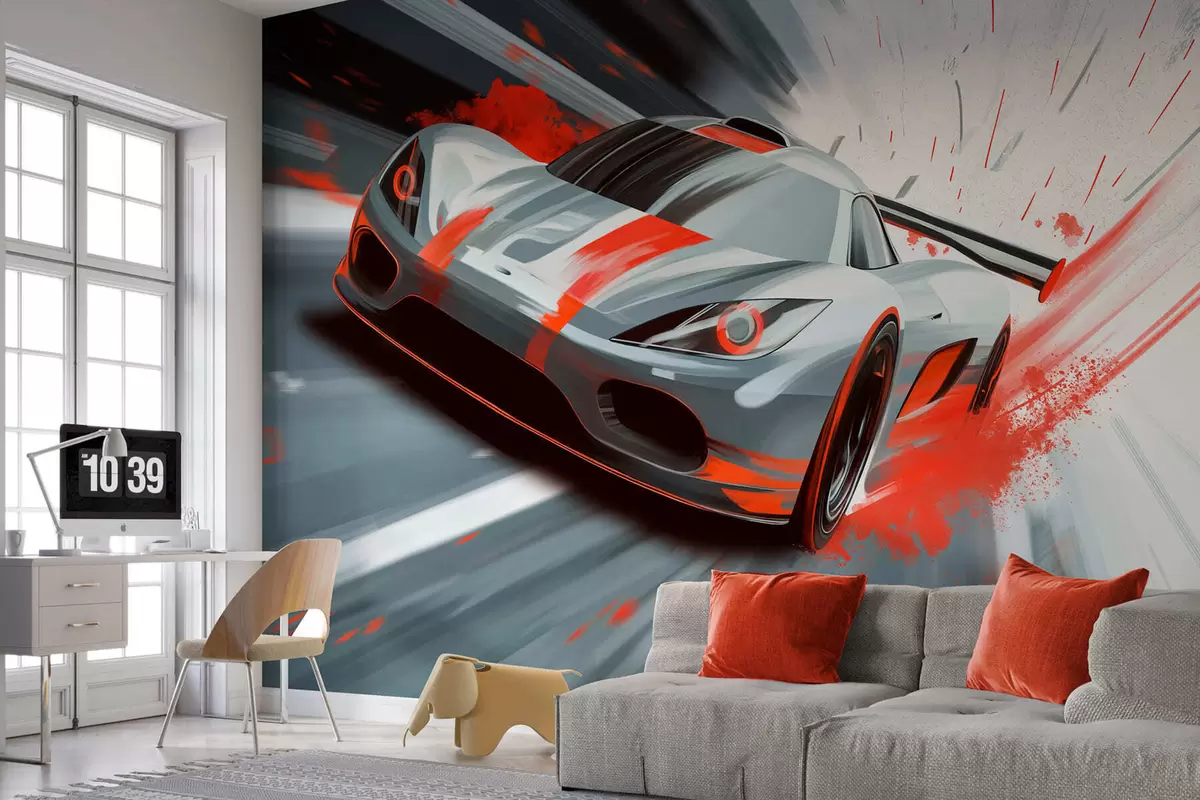 Valokuvatapetti dynaaminen urheiluauto digitaalisella piirustustyylillä ja punaisilla korostuksilla Nr w05069v1