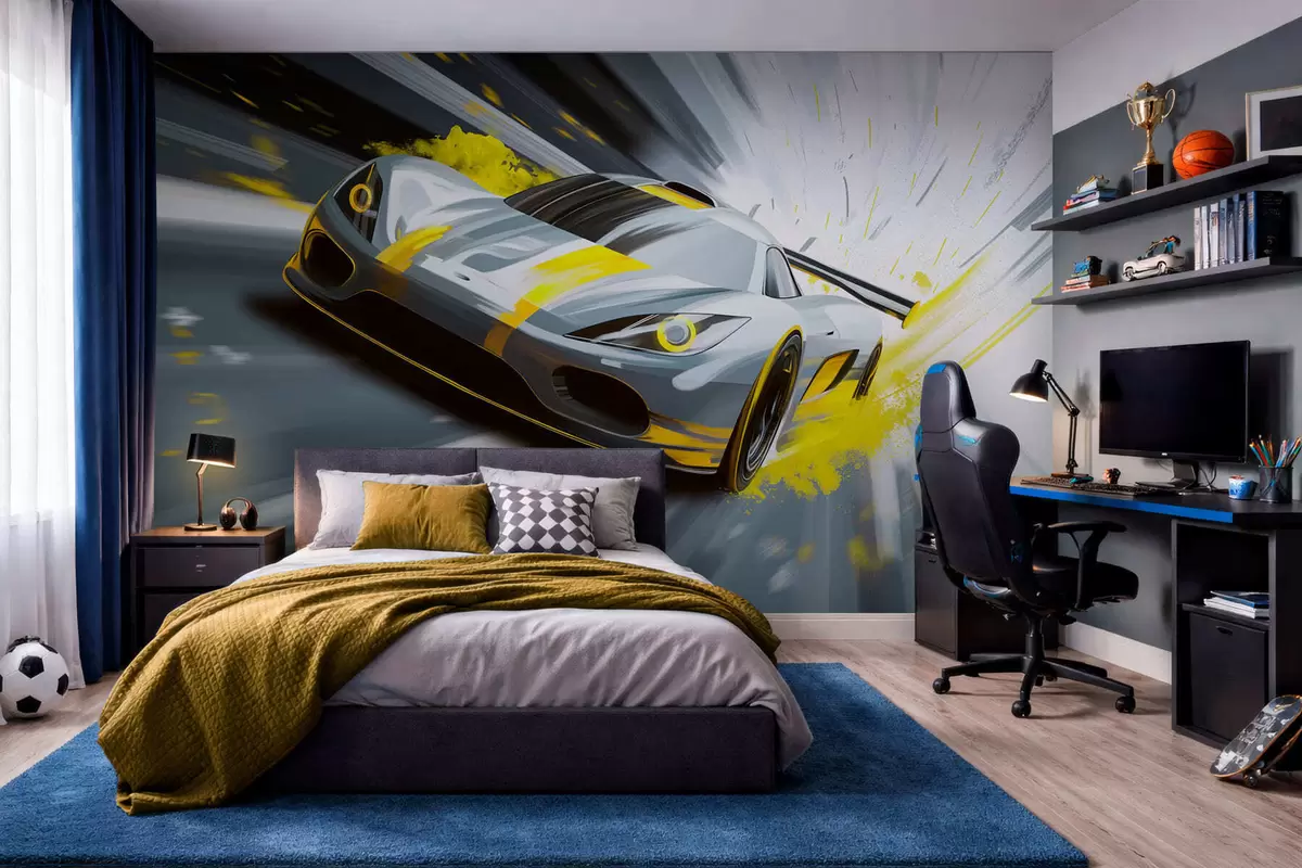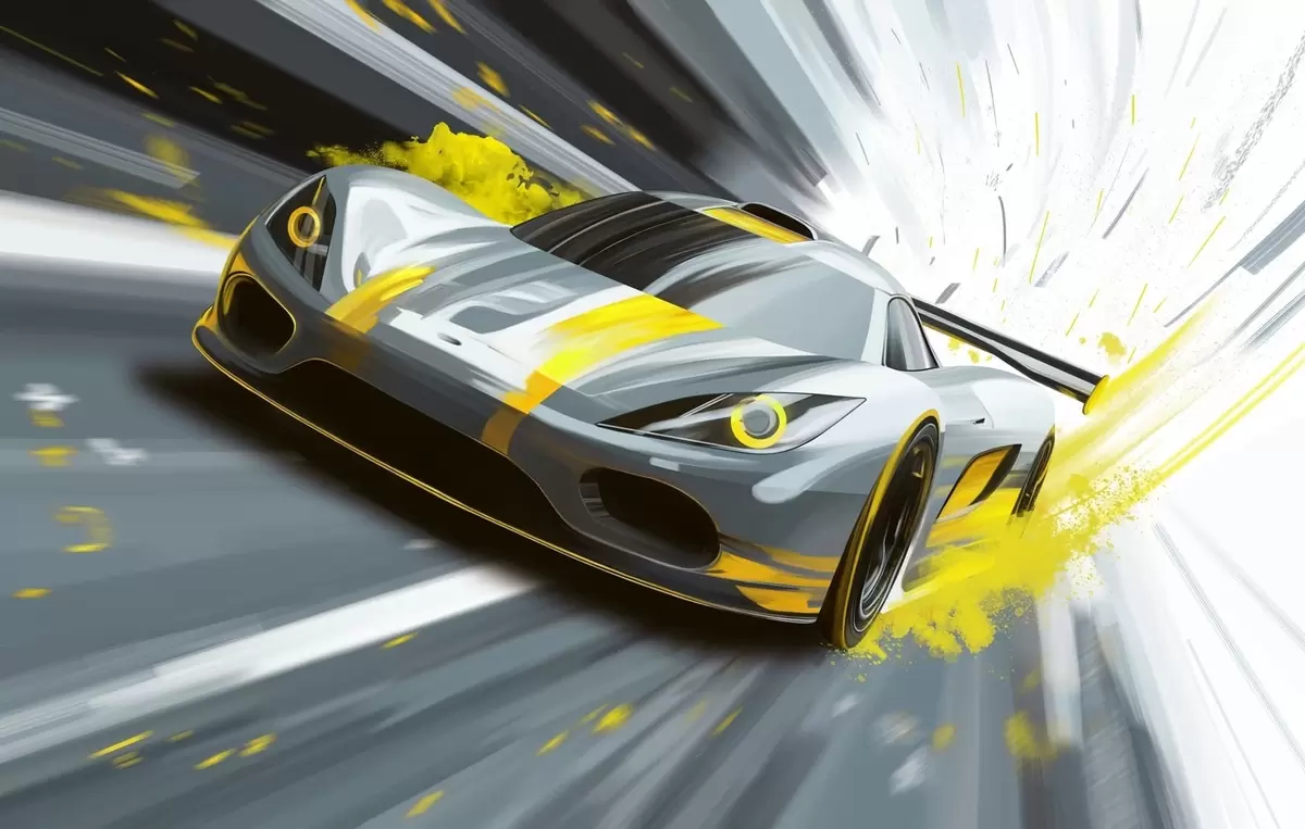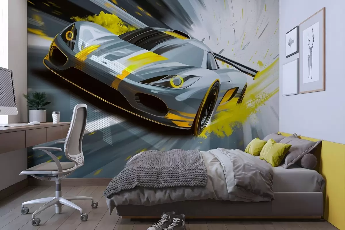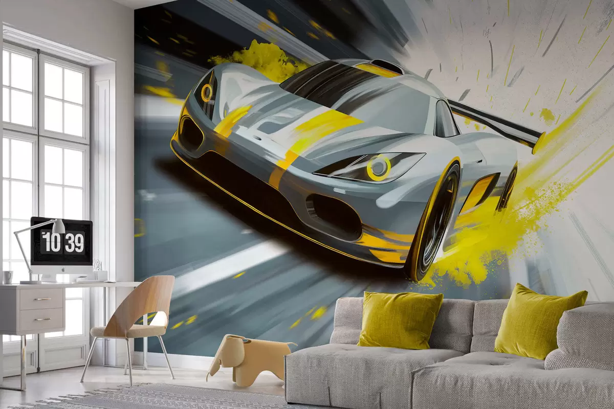 Valokuvatapetti dynaaminen urheiluauto digitaalisessa piirustustyylissä keltaisilla korostuksilla Nr w05069v2