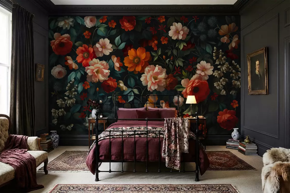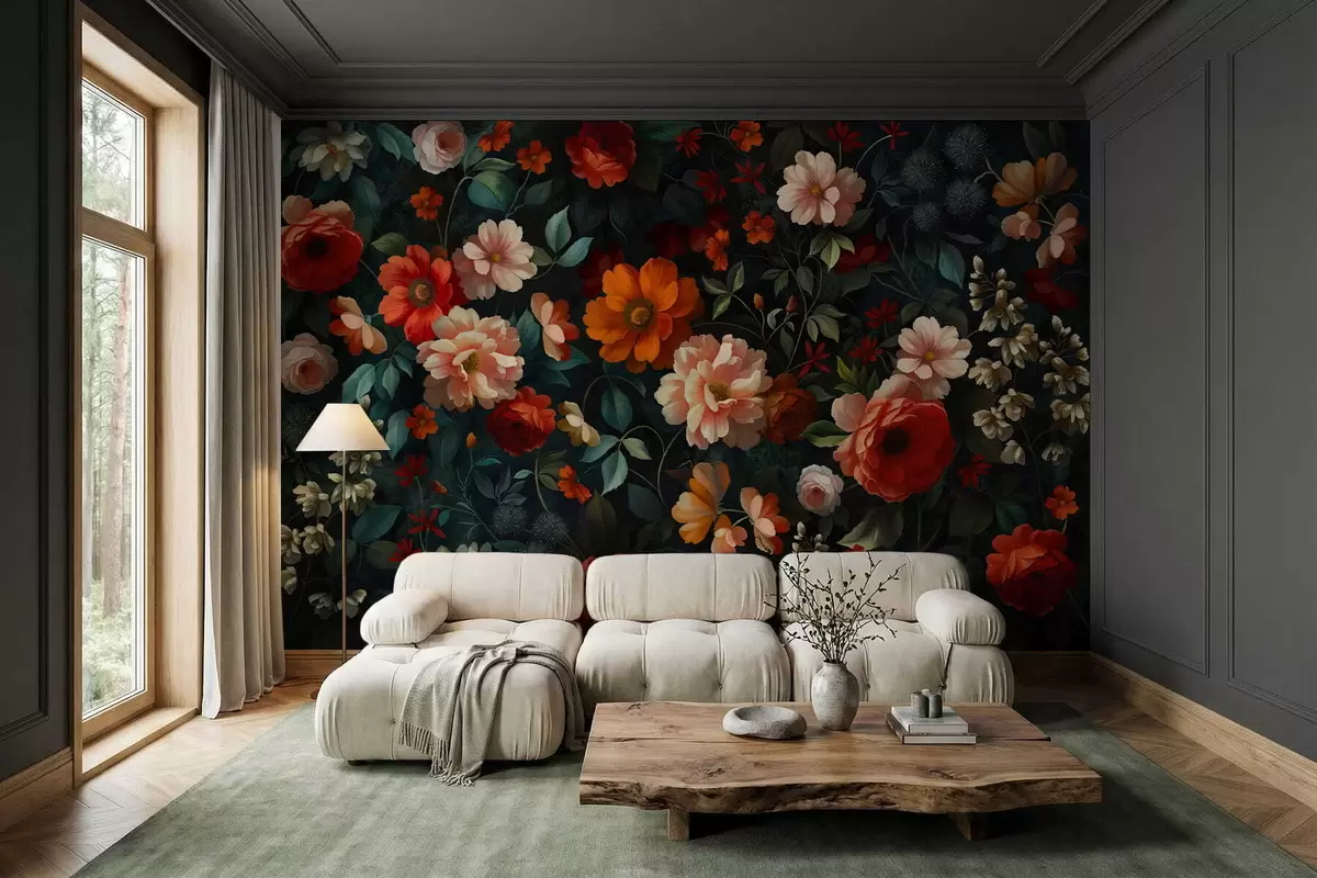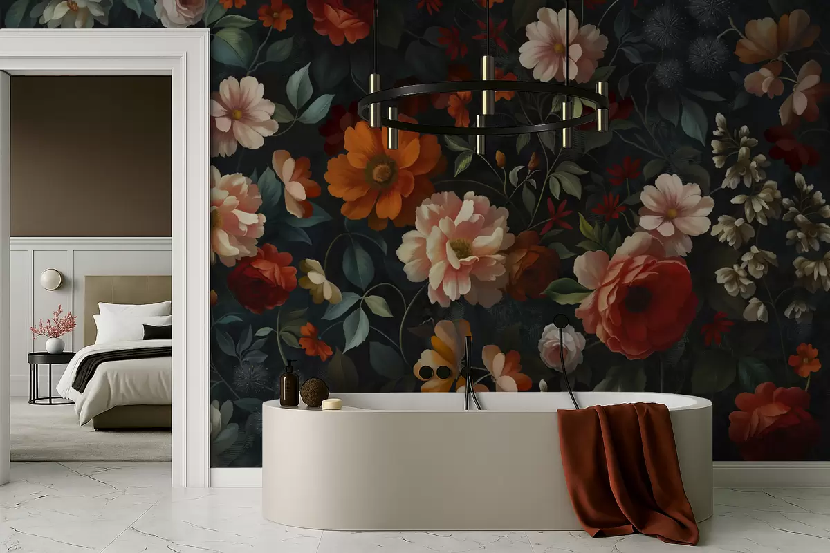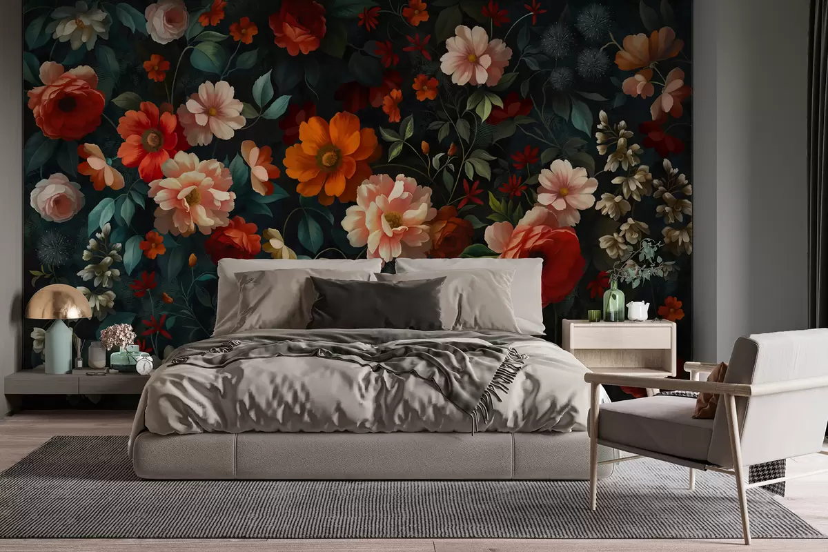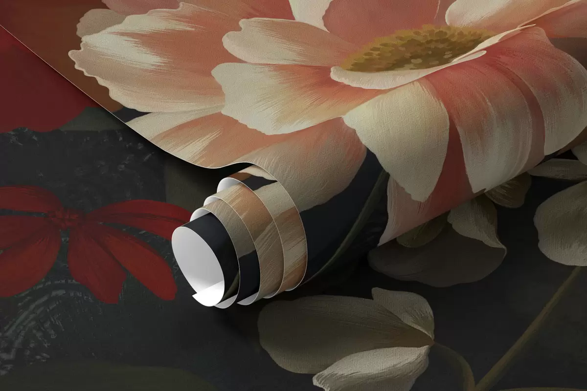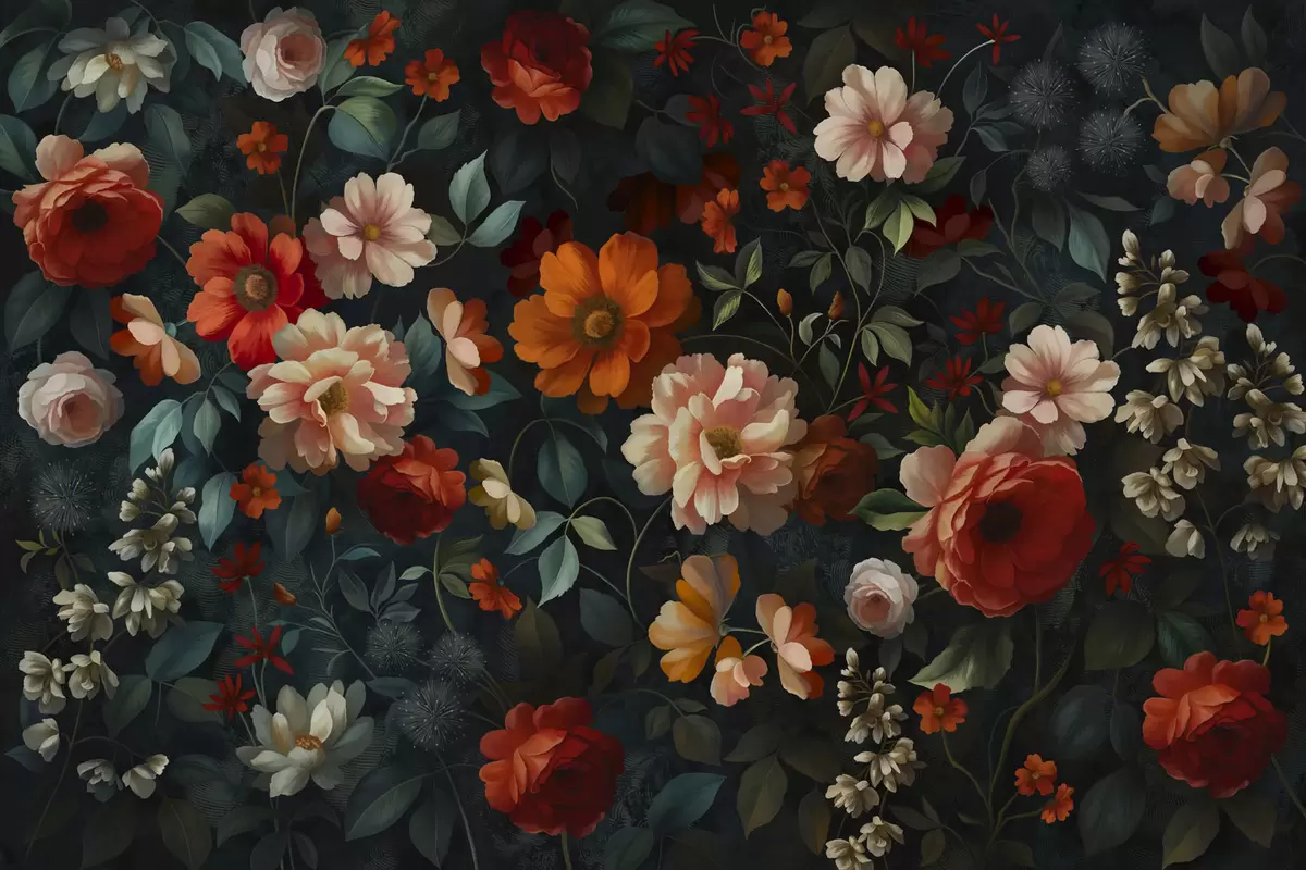 Valokuvatapetti Tumma kukkakuvio, jossa on reheviä puutarhakukkia Nr w05087