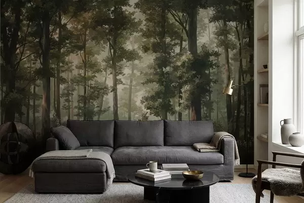Valokuvatapetti Metsäkuva, jossa on sumua, korkeita puita ja polku Nr w05089