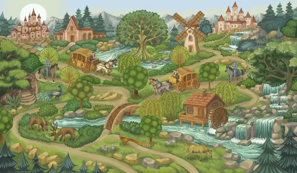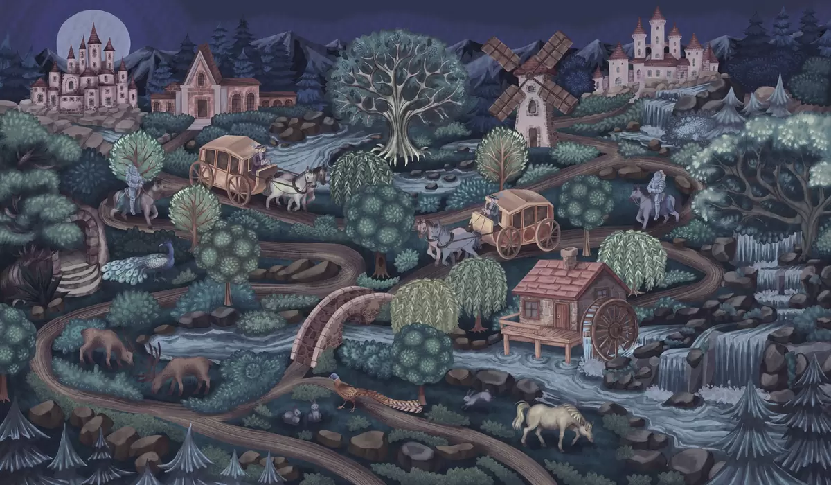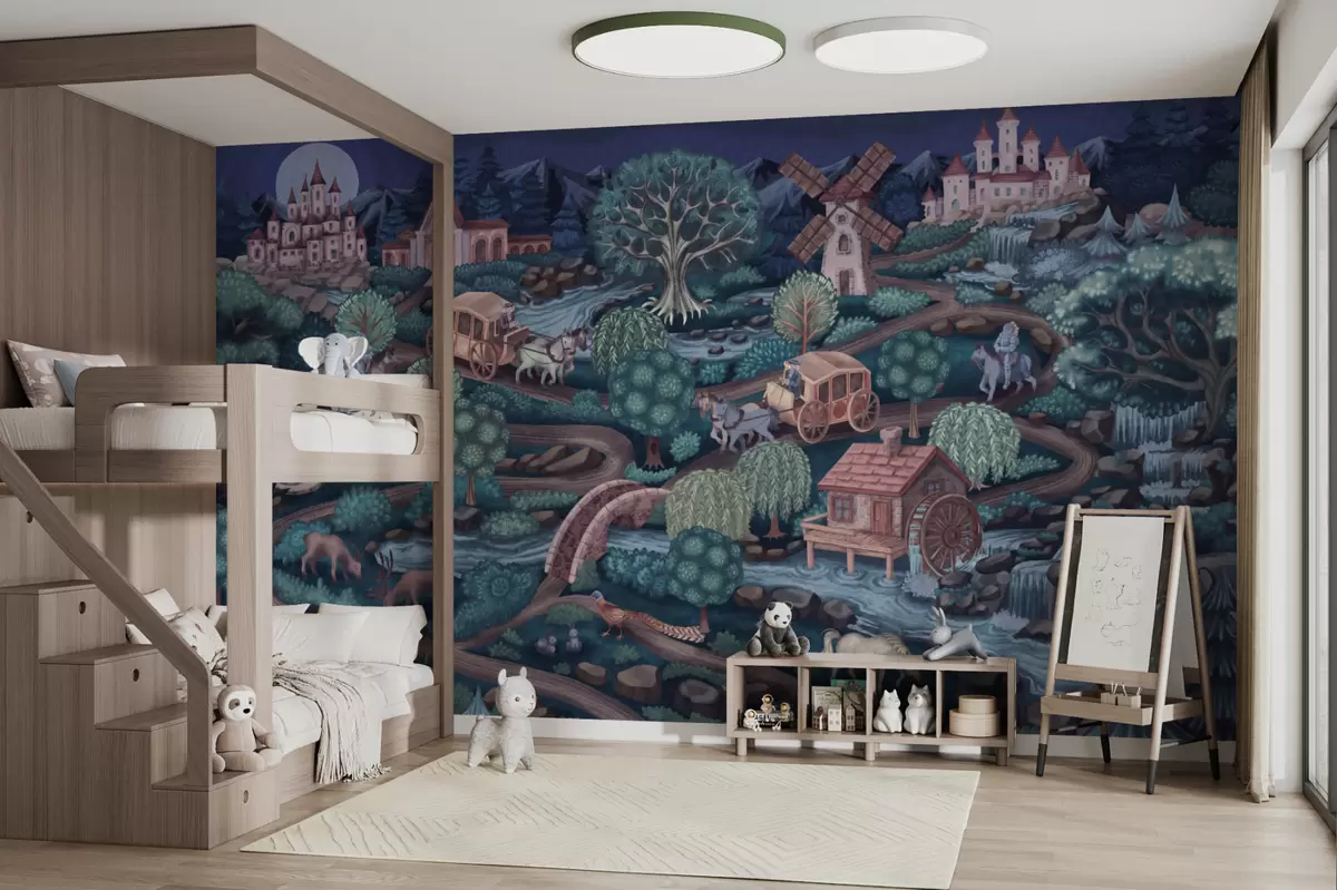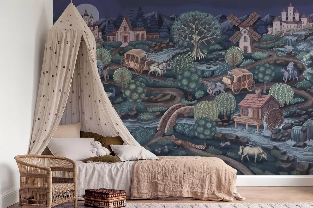 Valokuvatapetti Yökeiju-kohtaus linnoineen, myllyineen ja metsineen Nr w05091
